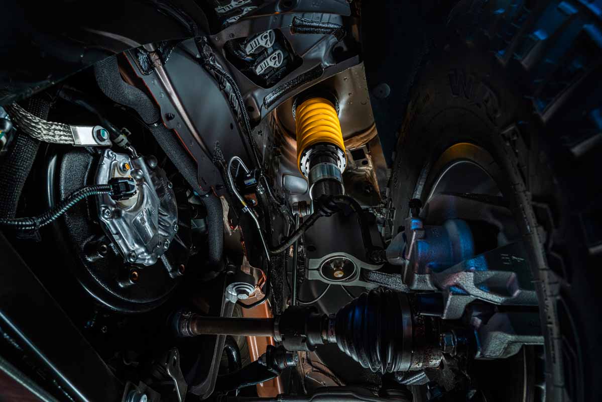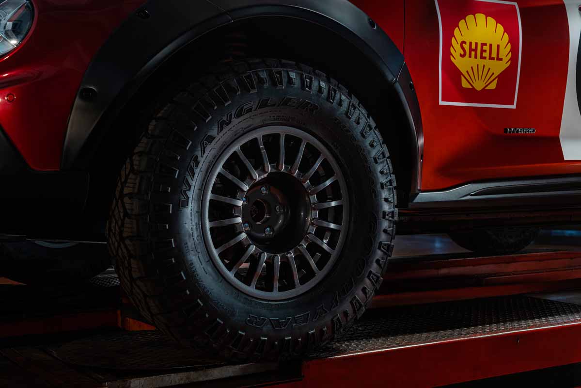 Inside, the interior has been modified with the fitment of a tubular cage to stiffen the bodyshell and to offer protection in the case of an incident at speed in the challenging desert environment. The rear seats have been removed to provide space for spare wheels and four-point harnesses have been added to secure the driver and navigator safely in their racing seats.