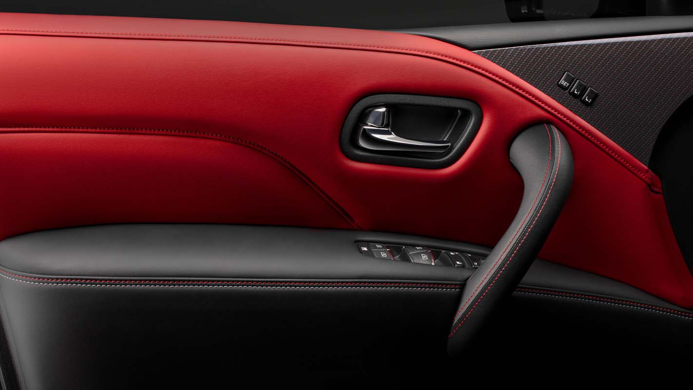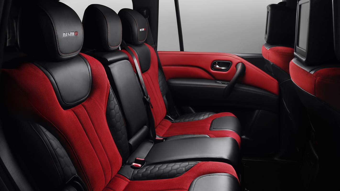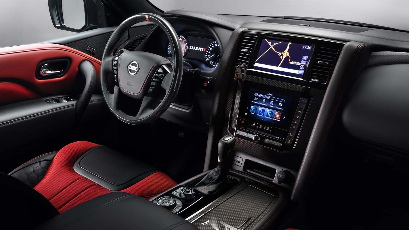 The signature NISMO red line wrap covers the circumference at the model’s base, the contour adding a boost to its definition, while the 22-inch, two-tone 2 tone aluminum wheels sport the NISMO logo to add a distinctive aesthetic. The SUV’s tuned suspension features Bilstein shock absorbers, which provide a sportier and improved handling.