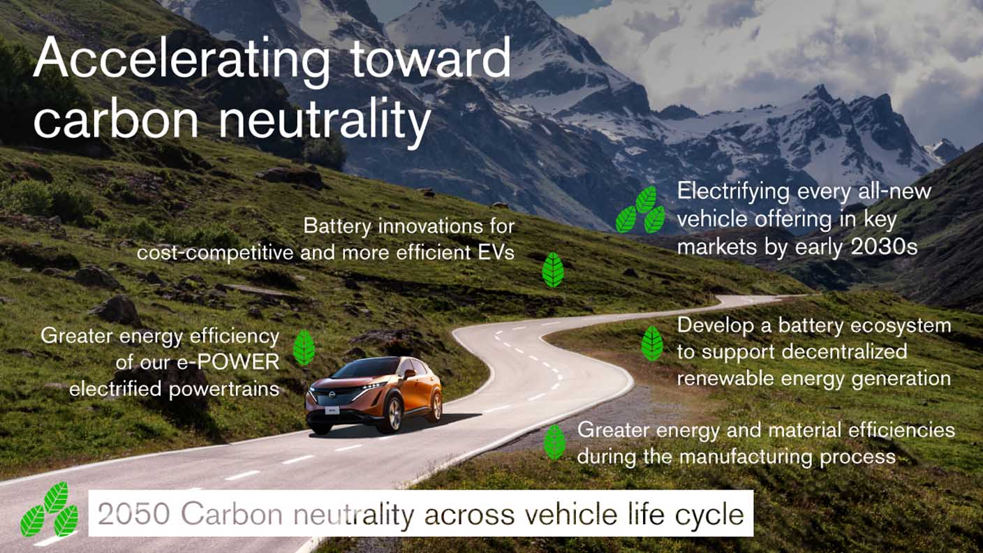 Nissan Motor Co., Ltd. has set the goal to achieve carbon neutrality across the company’s operations and the life cycle of its products by 2050.1 As part of this effort, by the early 2030s every all-new Nissan vehicle offering in key markets will be electrified.