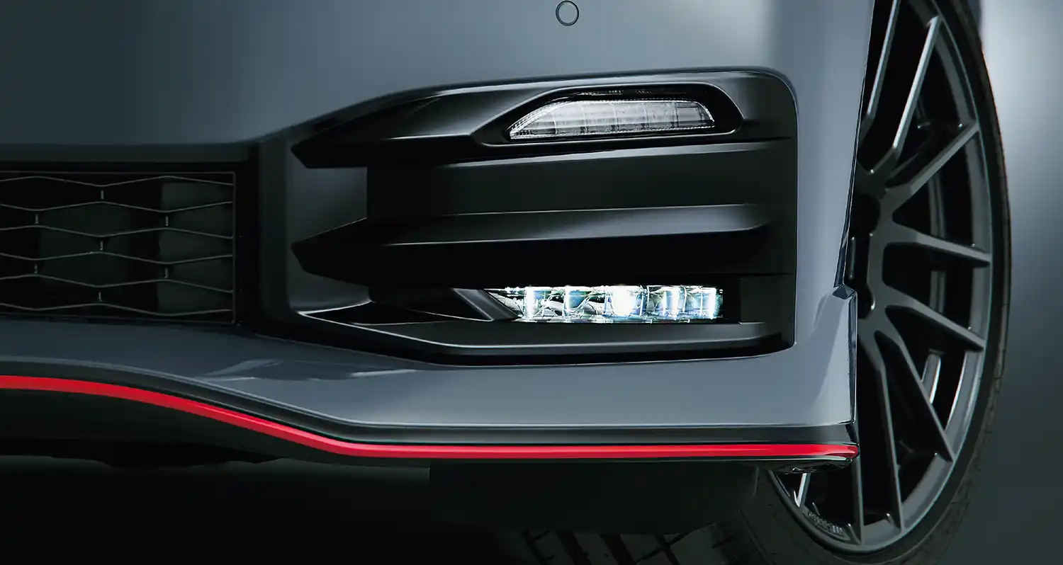 - A mere glance at the exterior makes it clear this is a NISMO model. It features a range of elements shared by new-generation NISMO road vehicles, including specially developed NISMO forward/rear bumpers and side sill covers with distinctive red accents, as well as NISMO-exclusive fog lamps and the NISMO logo.In addition, the moldings that surround the front bumper lower grille and fog lamps, and the surf lines running along the sides not only express dynamism but also improve high-speed stability by significantly enhancing downforce and reducing aerodynamic drag.Moreover, flow to the radiator and oil cooler has been optimized by redesigning the cross-section of the grille opening and the shape of the internal air guide, delivering cooling performance that ensures reliability while also reducing air resistance.