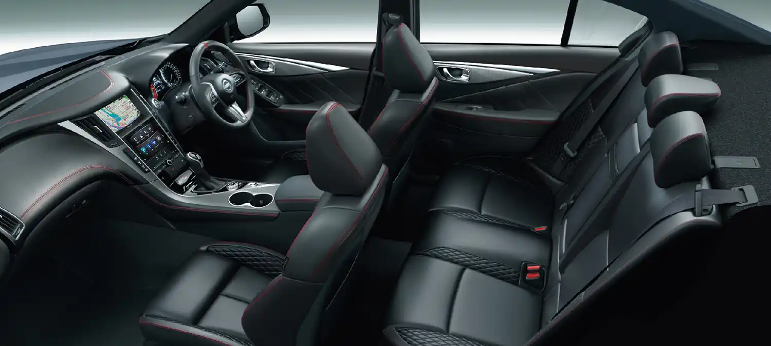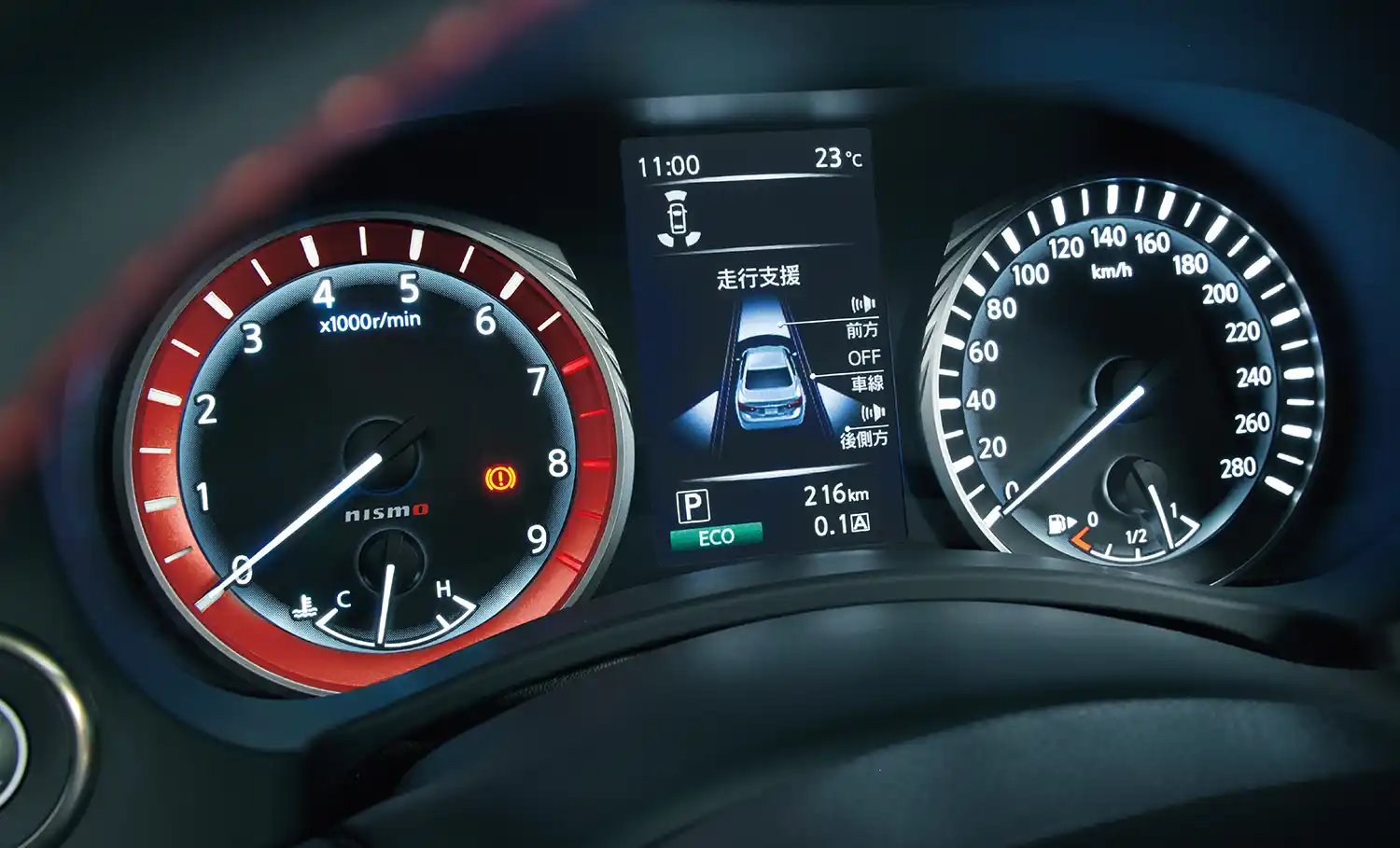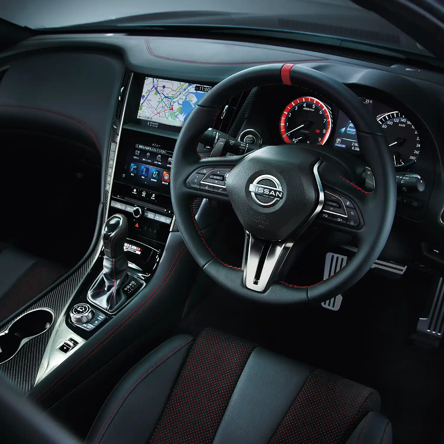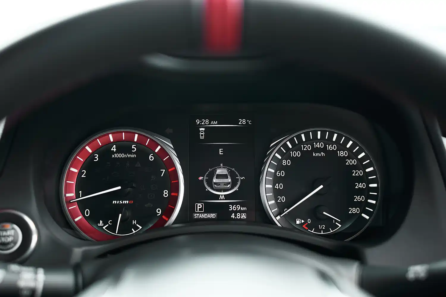 - The cabin features the same high quality fit and finish of the popular 400R model and its unified black tones a superb driving environment. The cockpit features a leather-wrapped steering wheel with a NISMO-exclusive red center mark, a 280 kph speedometer and a red-ringed tachometer sporting a NISMO logo that underlines the car’s performance. The NISMO-tuned black Recaro sports seats are accented with a red centerpiece*2. Their suede upholstery is positioned to centralize pressure, ensuring the occupants stay positioned even in sharp corners. The seat structure also helps ensure the high level of comfort required for grand touring.