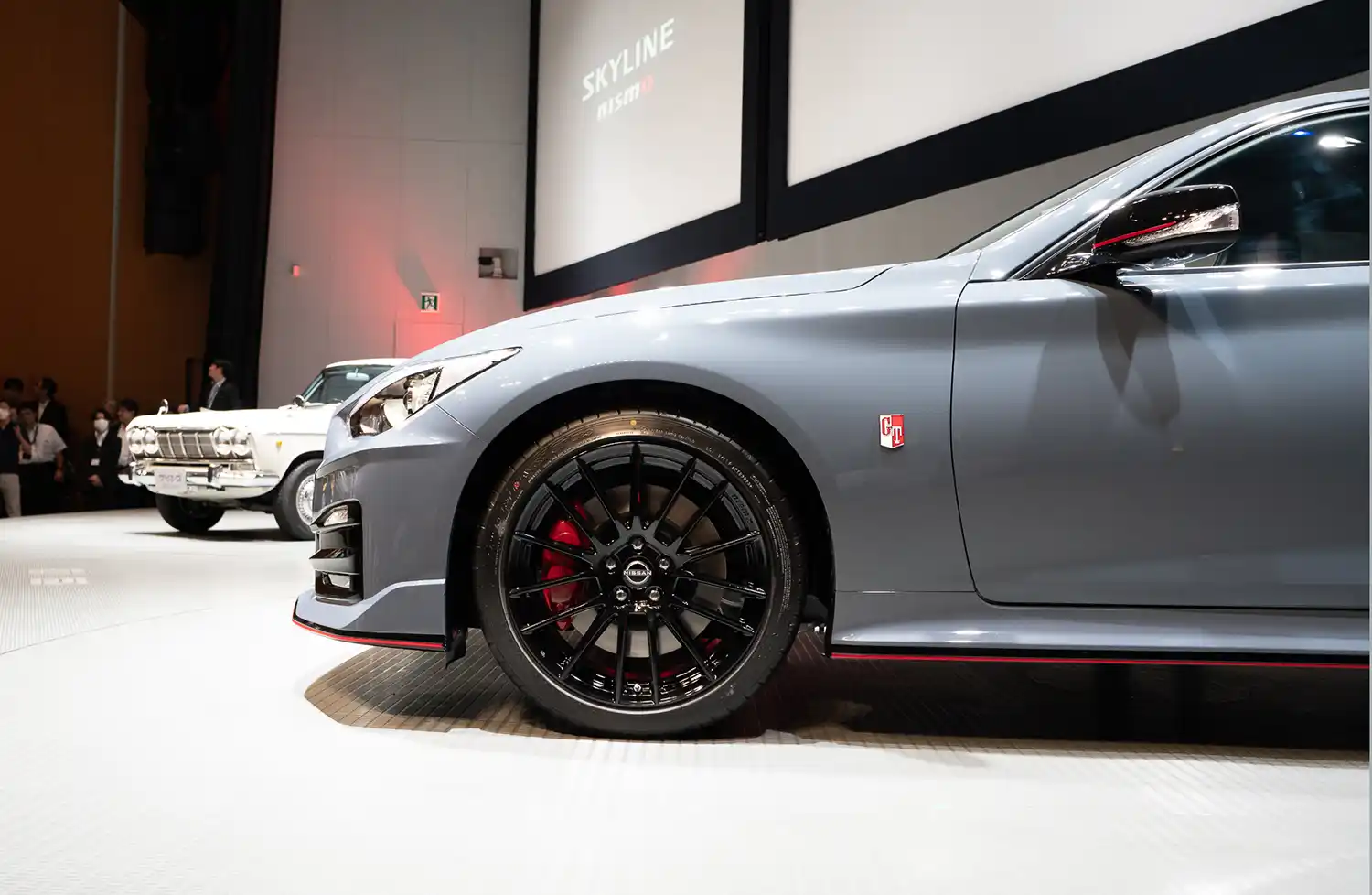 The Skyline NISMO Limited is a special specification model created to commemorate the 60th anniversary of the S54A-1 model Skyline GT. It features a design reminiscent of a race car, exclusive matte gunmetal painted wheels and a high-precision engine. As a sign of its special status, the Limited will feature a takumi label that displays the details of the master craftsperson who individually assembled the engine at the Yokohama Plant, an exclusive serial plate displaying its production number and a unique emblem. Available colors include White Pearl, NISMO Stealth Gray and Dark Metal Gray.