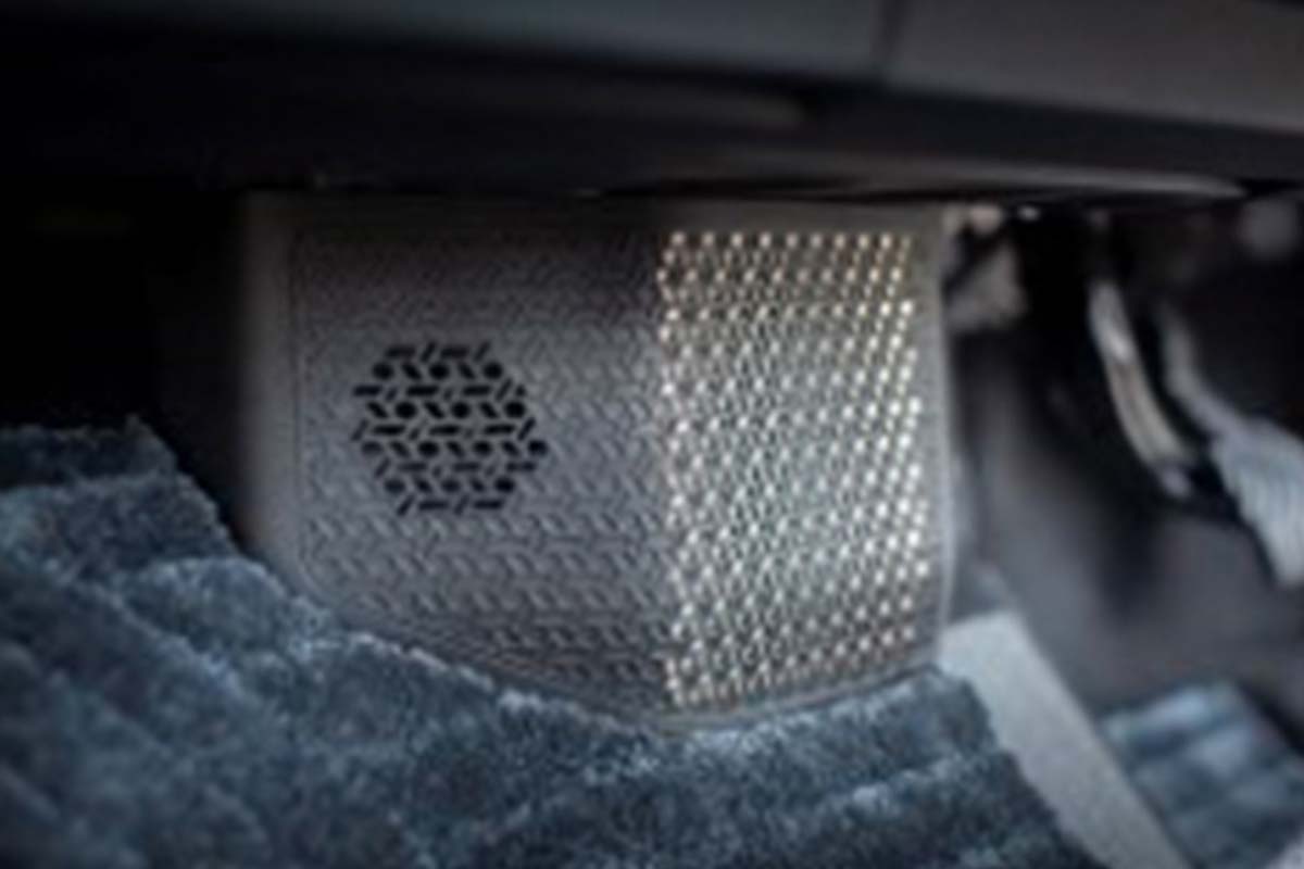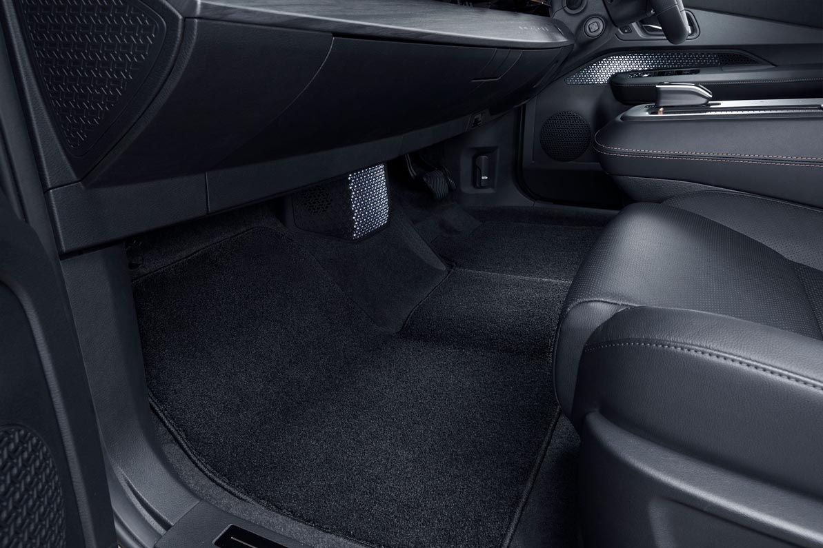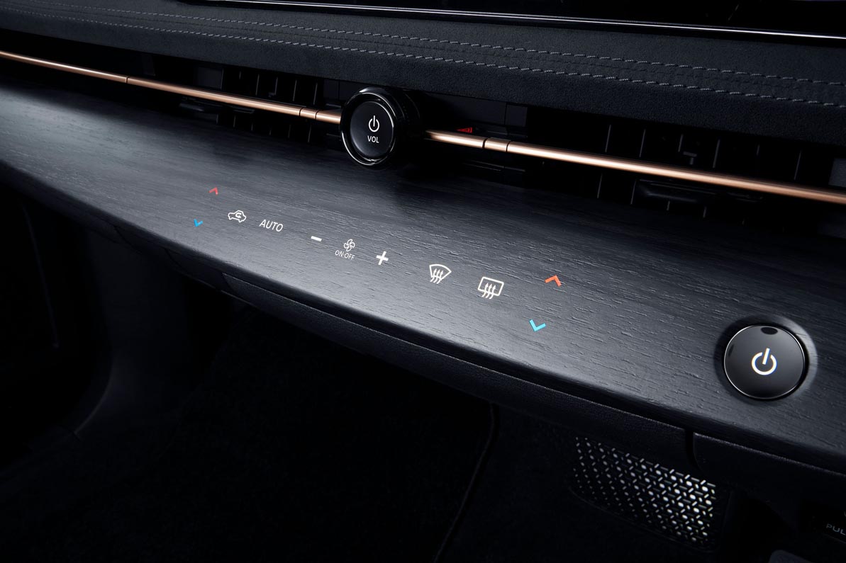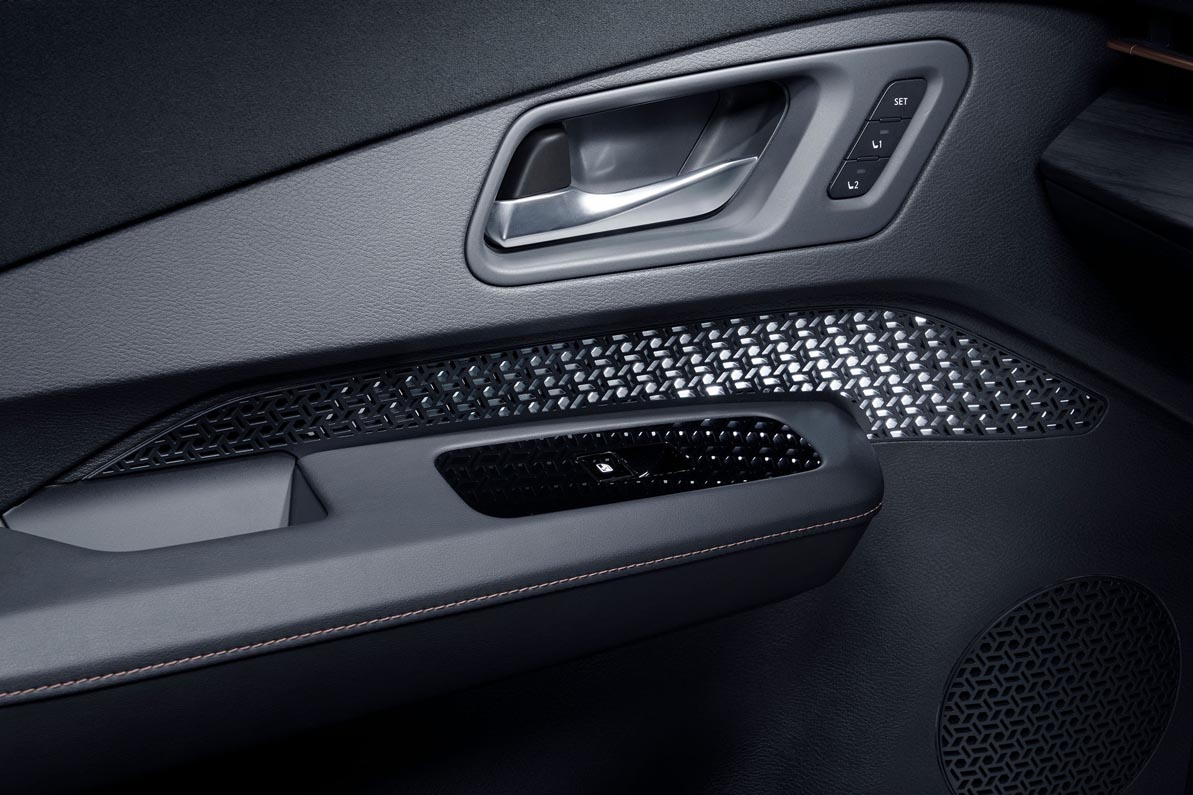 Part of this new design concept is the integration of distinct patterns and symbols into key spots on the vehicle to convey the Ariya’s Japanese heritage and influences. Among the more prominent of these is a stylized kumiko pattern, a traditional Japanese woodworking technique that arranges complex, intricate geometric shapes into captivating art. Kumiko-inspired patterns can be found on the Ariya’s exterior front shield, as well as several places inside the cabin. The pattern’s use of negative space made it a perfect design enhancement to house lighting and speakers without disrupting the room-like interior atmosphere.