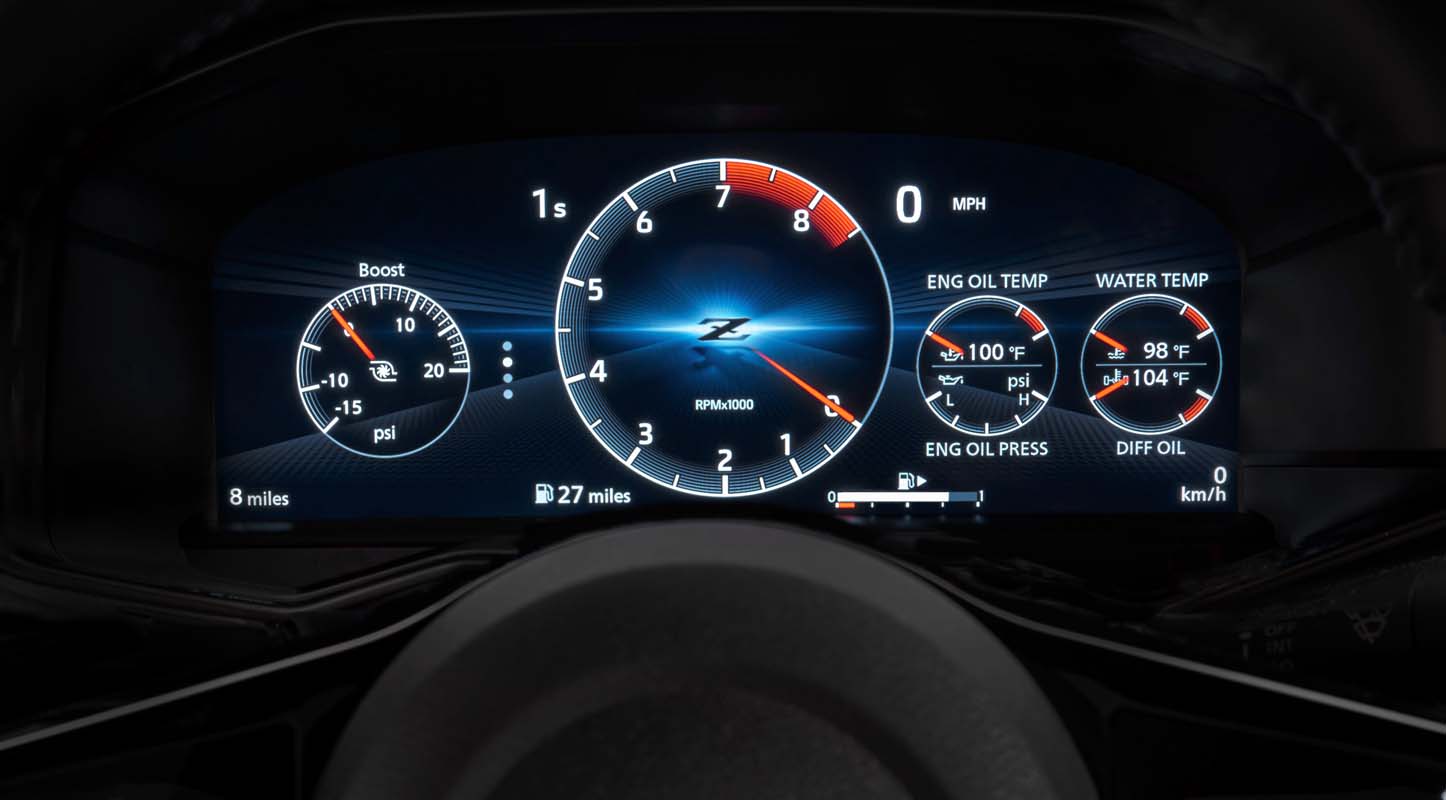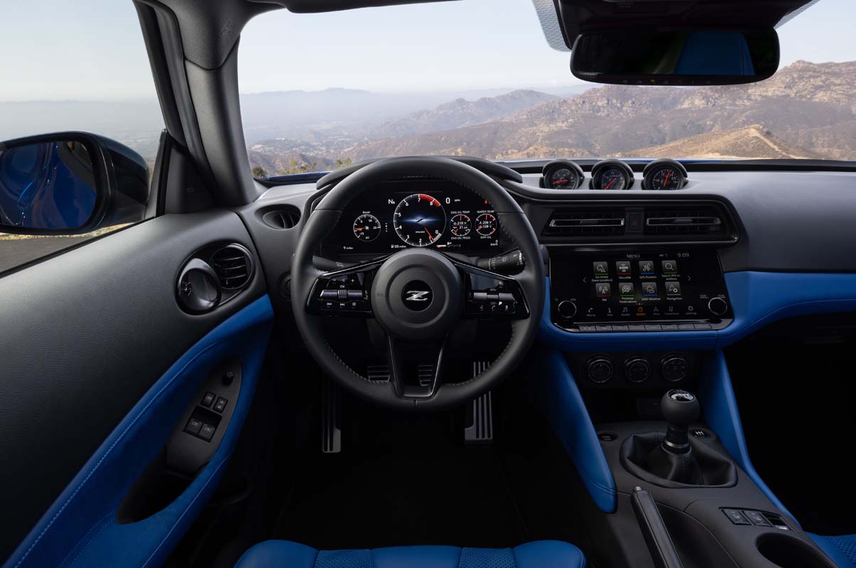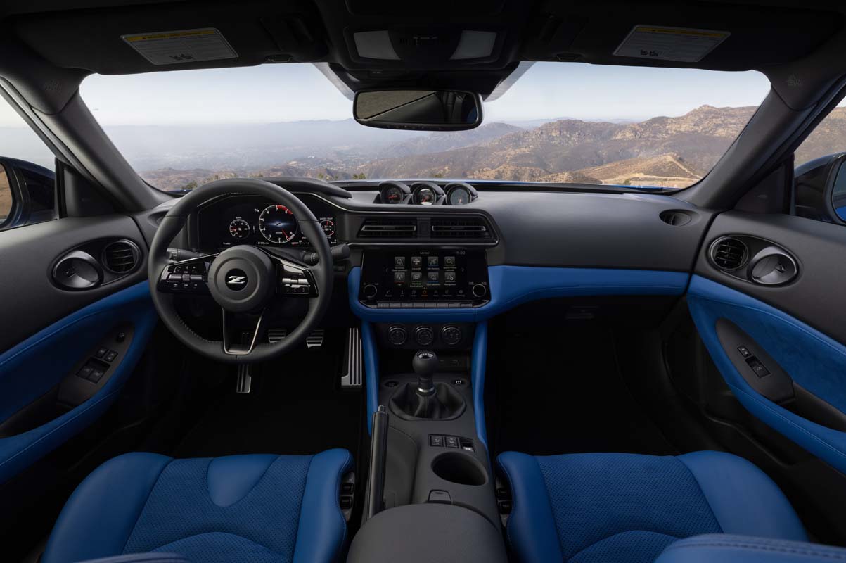 Designed to fit the driver and passenger like a glove, the cabin seamlessly blends modern technology with vintage Z touches. The center stack takes inspiration from previous generations, with three analog pod gauges on the instrument panel, 8.0-inch touchscreen audio display in the center and climate control switches near the shifter.