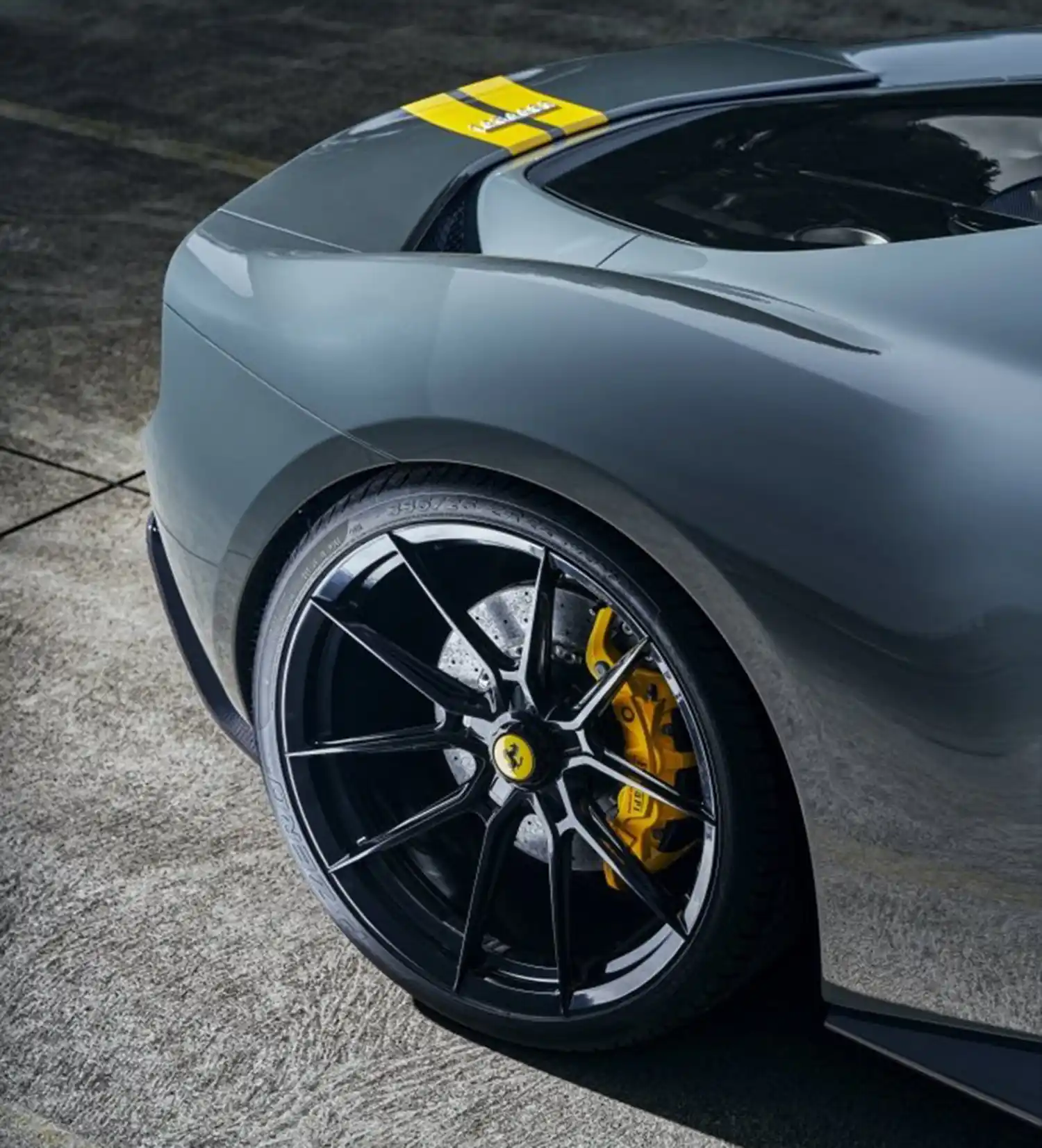 The attached photos show the two-seater fitted with a combination of size 9.5Jx21 wheels at the front with 255/30 ZR 21 tires and rims of size 11.5Jx22 with 335/25 R 22 tires on the rear axle. The different diameters on both axles place even greater emphasis on the wedge shape of the Ferrari.