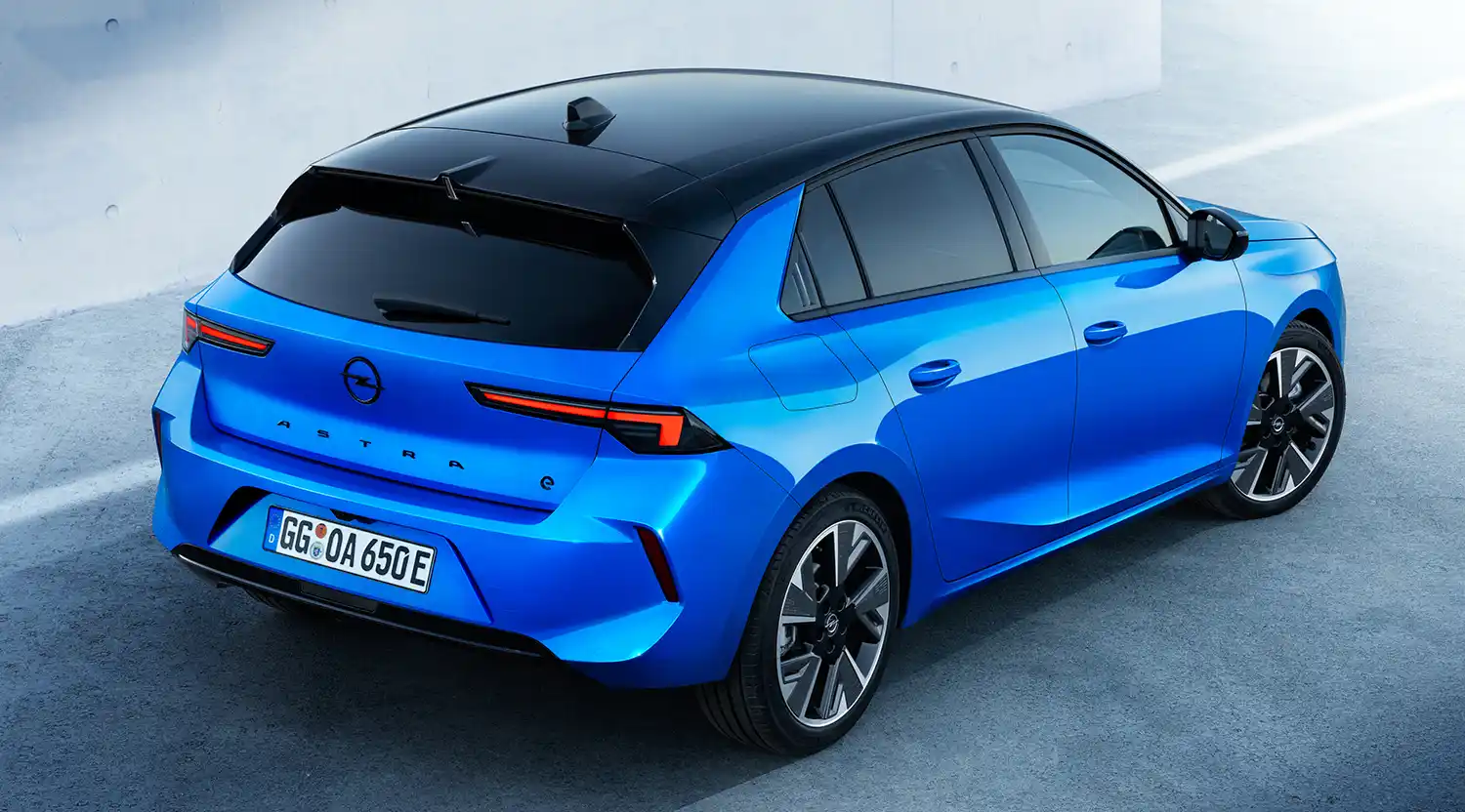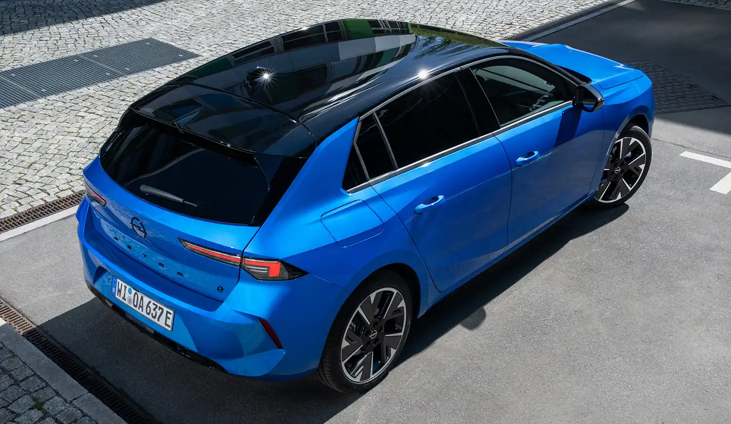 The Opel Astra Electric conveys a direct, dynamic driving feel at first glance. The new electric model in the Opel range is equipped as standard with 18-inch, five-spoke, light-alloy wheels in high-gloss black, which underline the bold and pure looks. The two-tone paintwork with the roof and exterior mirror-housings in carbon black also ensure that the Opel Astra Electric is an unmistakable eye-catcher.