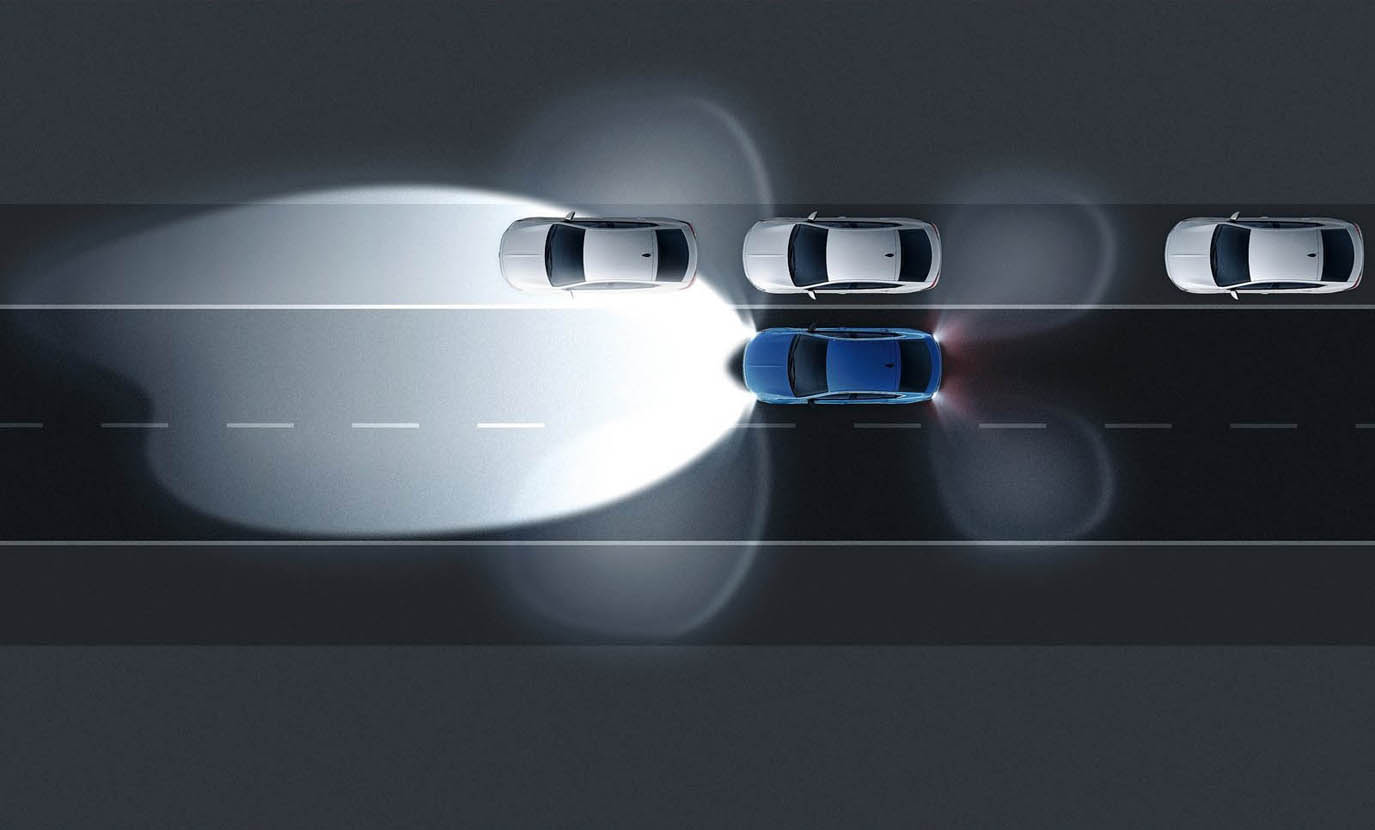 The main beam is adjusted seamlessly in milliseconds by two control units – one connected to the front camera and the other in the headlamp. The high number of continuously reacting LED elements results in a seamless adaptation of the light beam. The illuminated area is larger than before, approaching or preceding traffic is “cut out” more precisely.