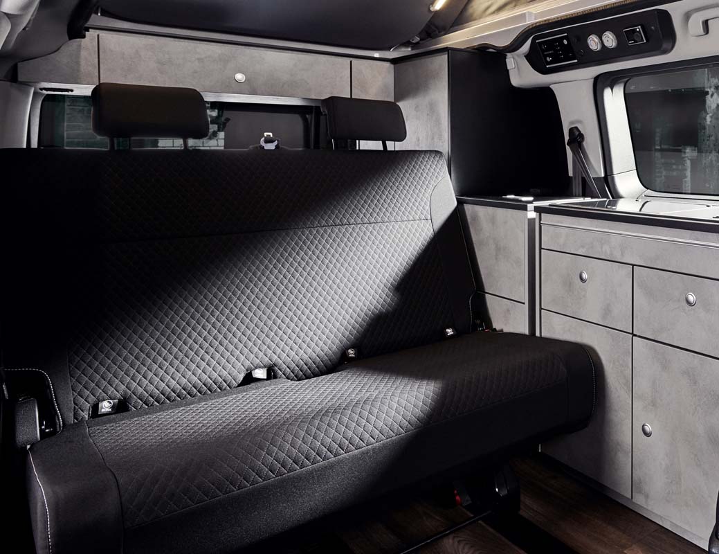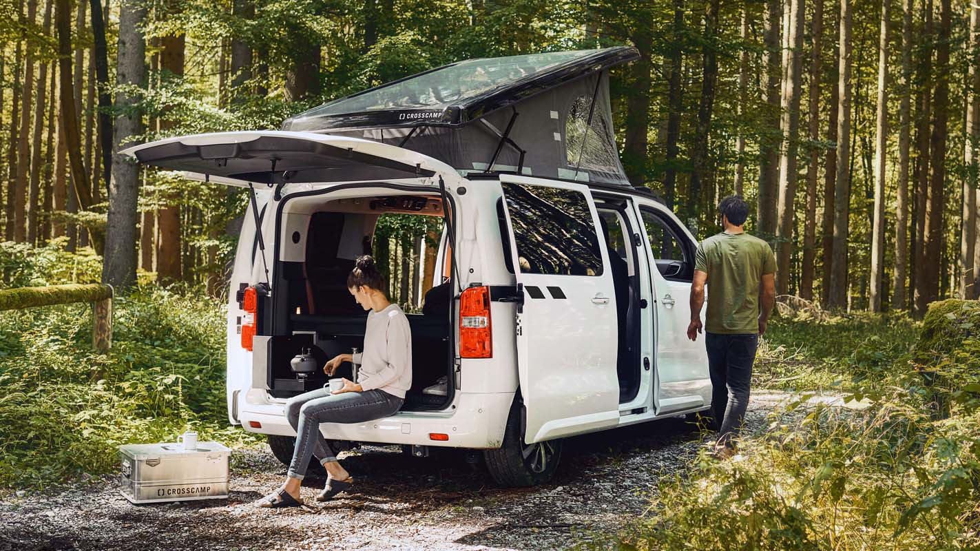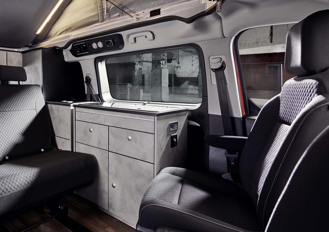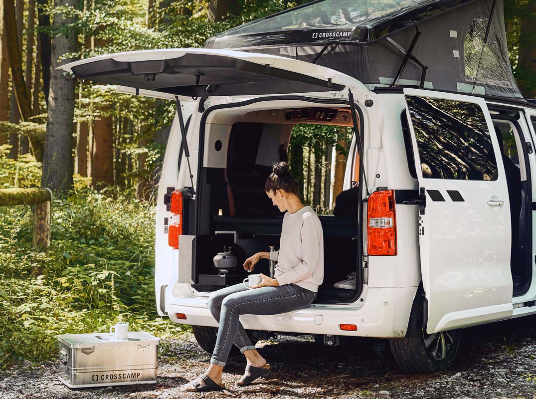 Like every Crosscamp, the all-electric Crosscamp Flex has everything needed for a relaxing trip. The practical equipment includes front seats that rotate by 180 degrees, a kitchenette, a wash basin, a gas cooker and fitted cupboards, as well as containers for drinking and waste water. Thanks to the rear bench seat that quickly turns into a double bed and two more beds under the rising roof, the Crosscamp Flex can accommodate four guests.
