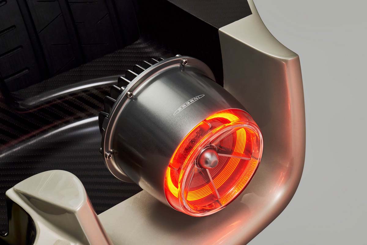 The details of its styling are few in number, but each is so carefully executed that it can be admired in its own right: technologically advanced, their shape is inspired by objects from the 1950s like the streamlined headlamps of Vespa scooters or the fittings of Riva speedboats. The forged wheels have a turbine-shaped carbon fiber extractor which draws hot air away from the brakes and reduces turbulence under the body. Mounted on carbon-ceramic discs, the brake calipers have a new, lightened design.