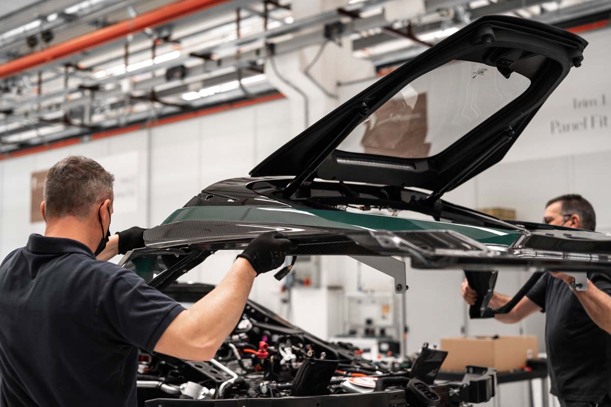 In the fifth zone, 80 per cent of the vehicle is assembled, taking two days. An ergonomic lift with bespoke jig helps the craftsmen and women achieve the tight tolerances required for elements such as the wheel arches and flat underfloor. The complex butterfly doors – sophisticated in design and integral to the vehicle structure – are also fitted at this stage, over two days, using another unique piece of mounting equipment that can support the weight of the doors and tilt in multiple directions to ensure fitment is perfectly aligned.