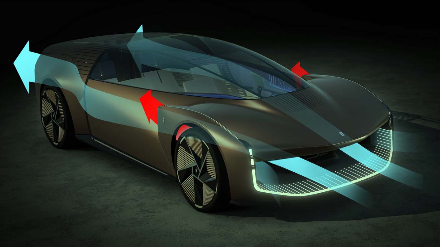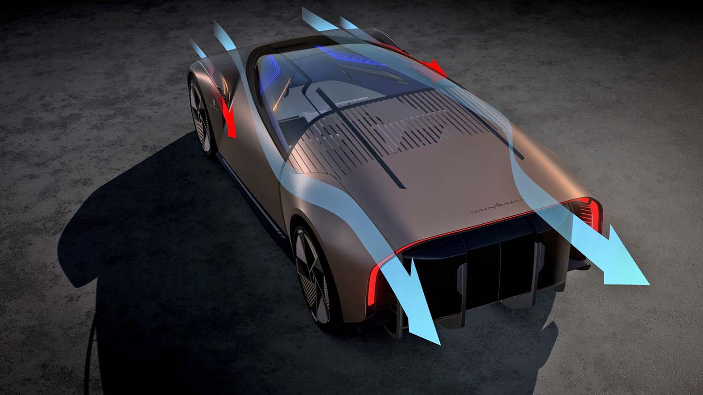 Pininfarina TEOREMA also embeds an innovative aerodynamic concept validated though CFD assessments, in light of Pininfarina’s unique experience enabled by its proprietary Wind Tunnel. When seen from above, TEOREMA is split into three separate parts. Between the central living space and the outside surface of each side of the car, open air channels allow air to stream through the whole vehicle. Duct sections smoothly decrease their area and this shape generates an acceleration of air flow passing through them. The high-speed jets that exit at the rear end of the car reduce the wake dimension improving the aerodynamic performance, helping reduce drag and improving the car’s efficiency.