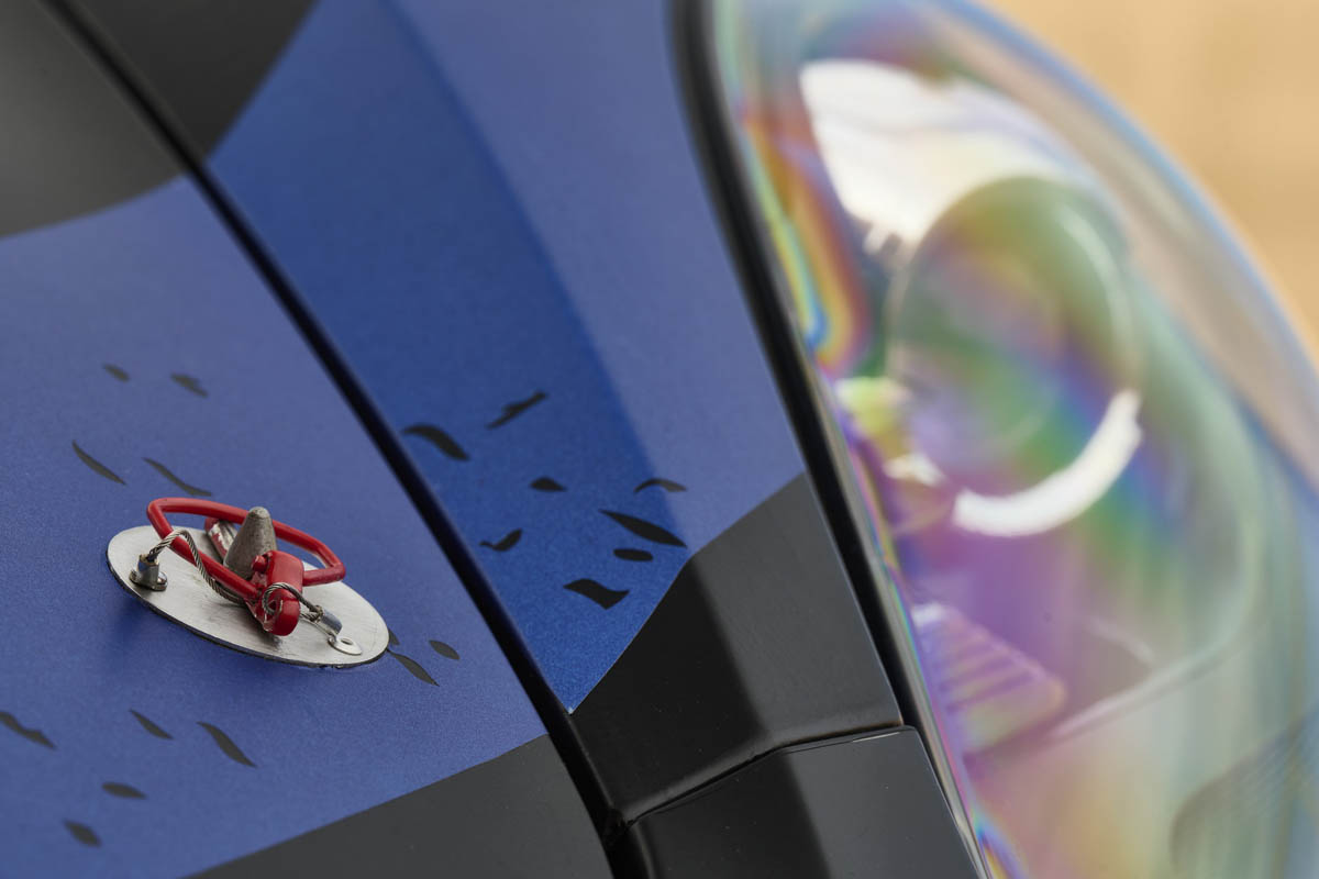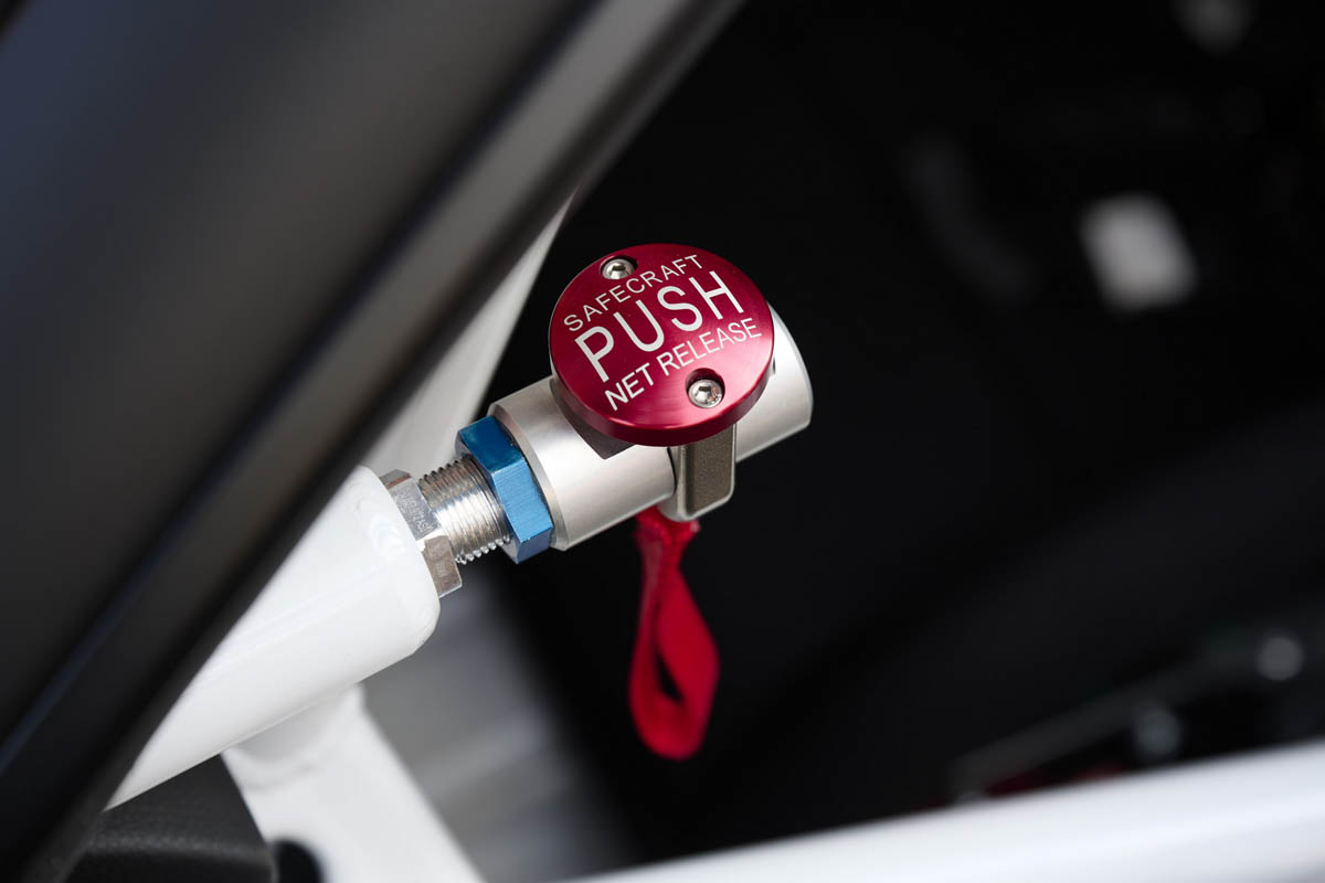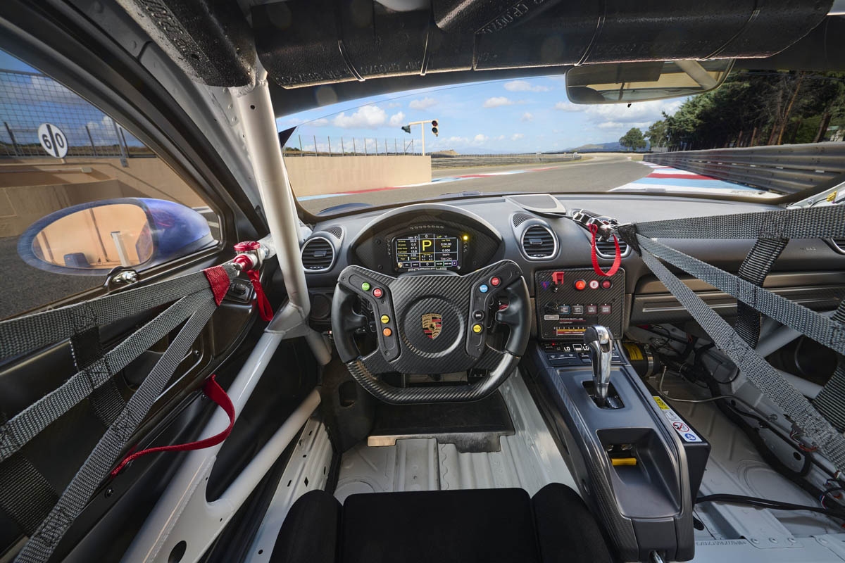 The Porsche 718 Cayman GT4 RS Clubsport is equipped to meet all the prerequisites allowing it to compete in racing events directly from the factory. This begins with the welded-in roll cage and the fore and aft adjustable Recaro racing seat, and extends from 2023 compliant six-point racing safety harnesses and safety nets to the fire extinguisher system and the built-in air jack system with three jacks. The new safety foam on the driver’s side meets the international requirements of the SRO racing series. The FT3 safety fuel cell can take up to 115 litres of fuel, making it suitable for endurance racing. Additionally, Porsche offers two different exhaust systems, allowing the GT4 RS Clubsport to compete at tracks with stricter noise limits. The vehicle is also prepared for the later addition of homologated headlights or openings in the bonnet for fast refueling to enable the car to be converted quickly for nighttime endurance racing.