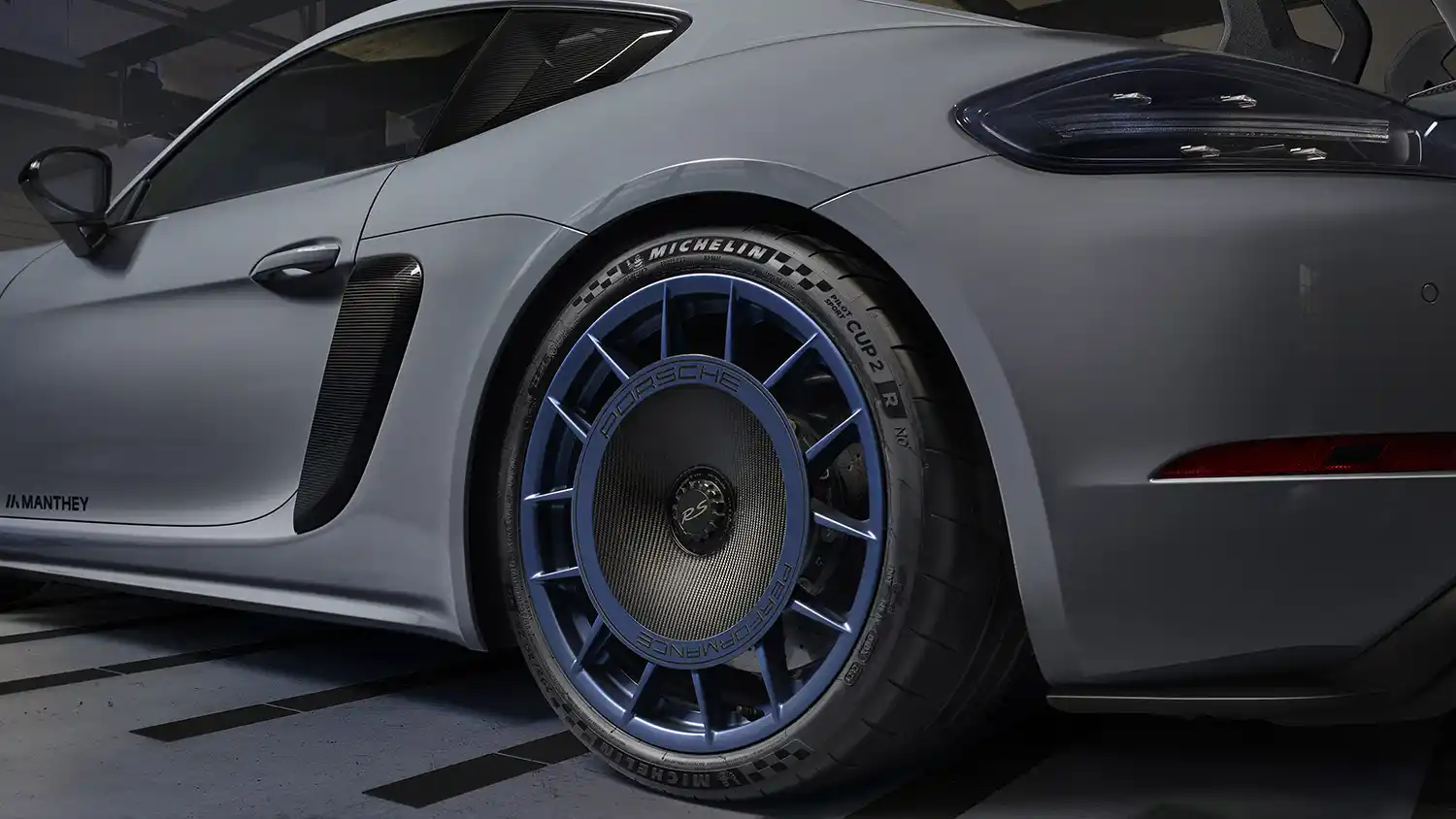 The Manthey Kit for the 718 Cayman GT4 RS is recognizable by the comprehensive changes to the additional functional aero parts. At the front of the car, flaps and new air curtains with a wheel arch Gurney flap and a new carbon underbody with diffusers improve the downforce on the front end. The kit includes a new rear wing that is approximately 3.4 inches wider than the part it replaces and features larger side blades that contribute to an increase in downforce at the rear axle. The wing also now has four positions as compared to the three stages of the standard setup. To be able to withstand the higher aerodynamic forces, the bodywork of the rear engine cover is reinforced with a carbon-weave finish. The aerodiscs on the rear wheels are also made of carbon fiber reinforced plastic. These reduce the turbulence around the rear of the car and visually round off the aerodynamic package. They can be customized with an optionally available decorative film. At approximately 124 mph, when the rear wing is set to the Performance position intended for track use, total downforce increases from 196 to 372 lbs.