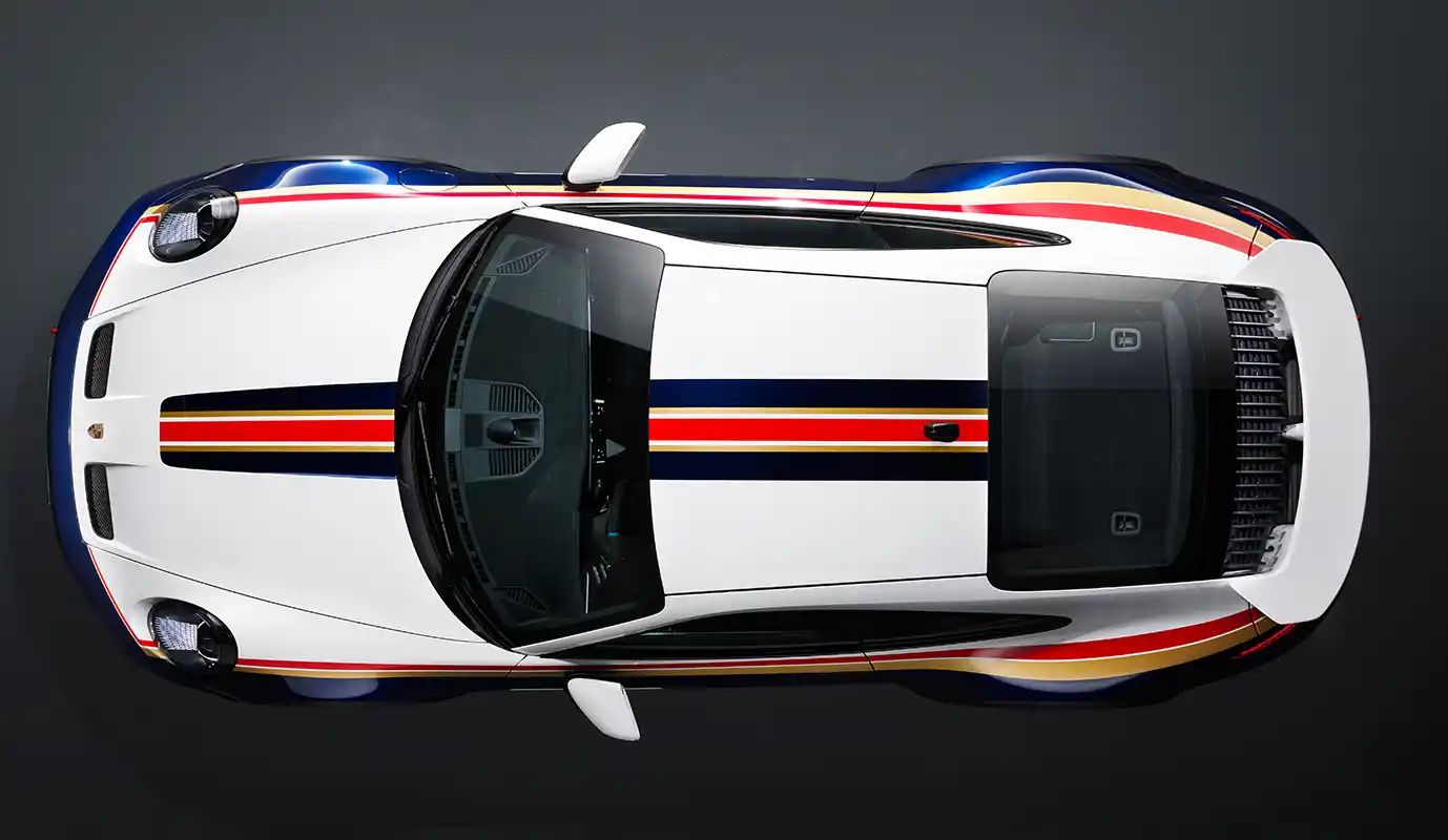 At the heart of the optional Rallye Design Package from Porsche Exclusive Manufaktur is a two-tone paint finish in White/Enzian Blue Metallic. This is the first time that Porsche has implemented the combination of bi-colour paint and decorative foiling in series production. On the side of the vehicle, the customer can choose an individual race number between 0 and 999. In addition to the rallye stripes in red and gold, the 911 Dakar with Rallye Design Package, whose appearance is based on the winning vehicle of the 1984 Paris-Dakar Rallye, also bears the “Roughroads” lettering on the doors. The term is a registered trademark and reflects the concept of the 911 Dakar and its suitability for driving off-road. The white-painted rims and the red taillight strip, in contrast to the standard vehicle, round off the distinctive appearance. Further highlights can be found in the interior: Extended Race-Tex and leather surrounds as well as seat belts and accents in Sharkblue.