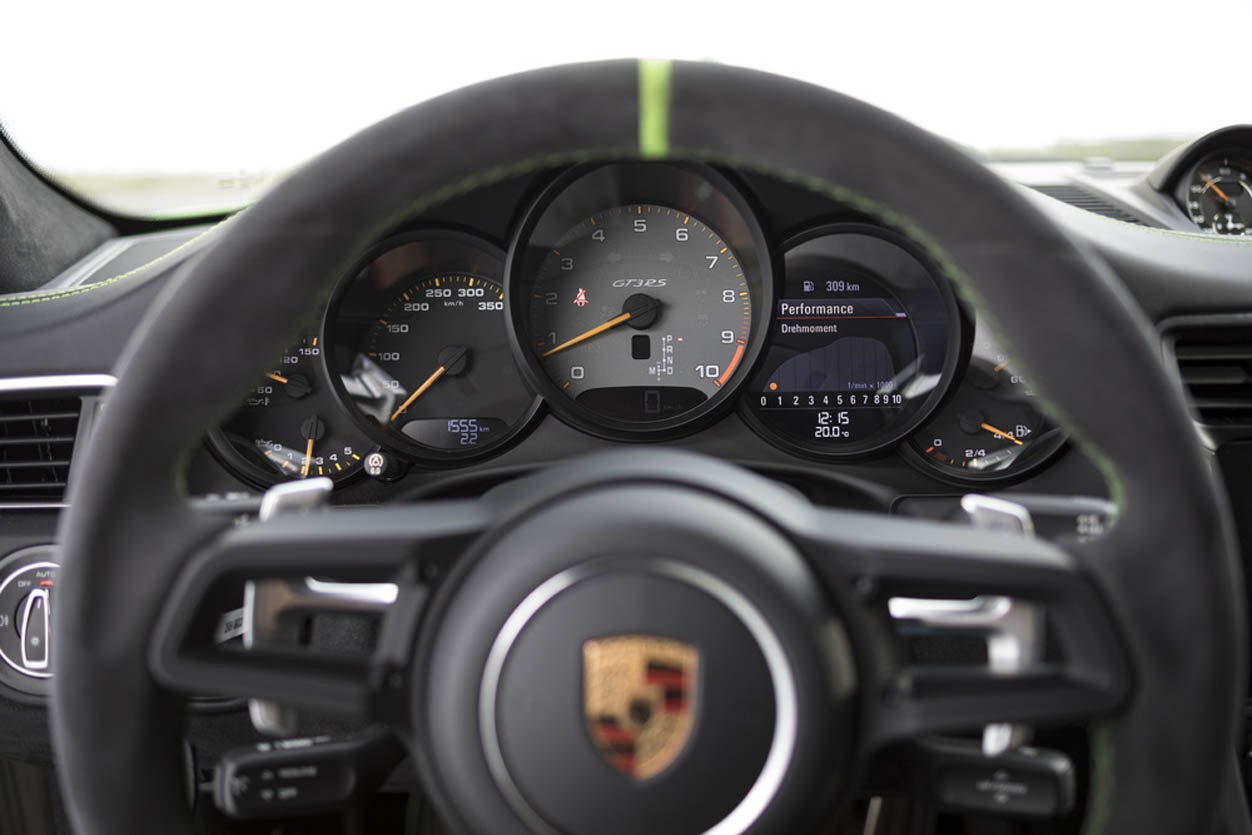 Porsche also offers an optional Chrono package for the Porsche 911 GT3 RS. In addition to the analogue and digital stopwatch in the dashboard, it includes functions for the display, storage and analysis of measured lap times, as well as a performance display. This provides the driver with information about the time and distance of the current lap, as well as the previous lap time and the times achieved so far. The fastest lap and the remaining fuel range are also displayed. Any lap routes can be recorded and reference laps can also be set.