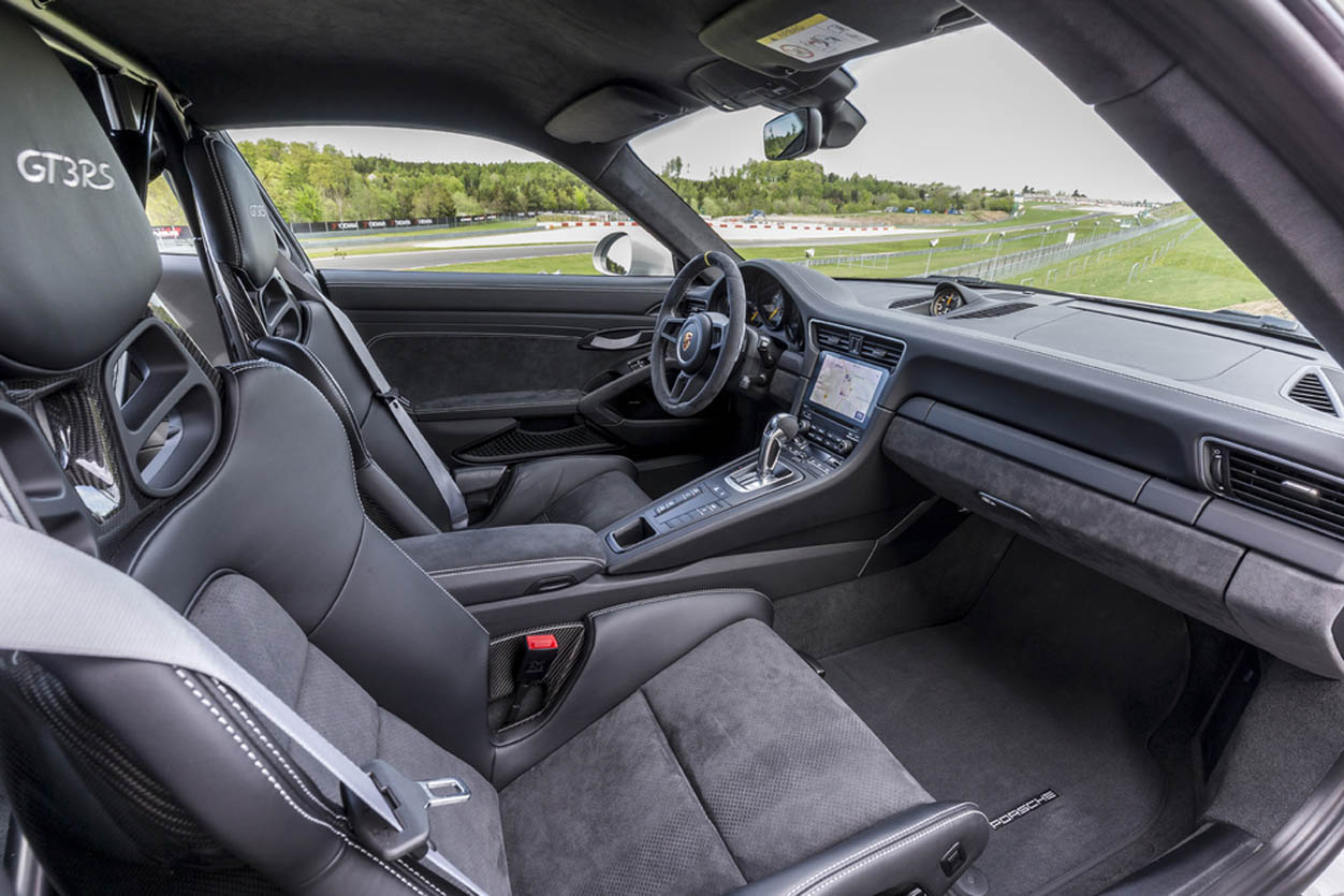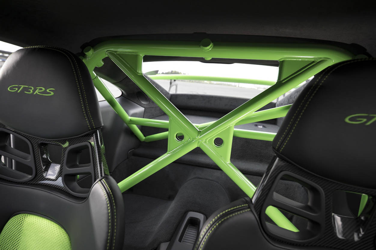 The interior is dominated by the bolted titanium roll cage, which is approximately twelve kilograms lighter than the steel roll cage featured in the Clubsport package. Even small details have been optimised to minimise weight, such as the ultra-light gearshift paddles and the steering wheel cover made from CFRP, both of which come in a carbon-weave finish. Even the floor carpet has been reduced. In the interior, the Weissach package logo on the headrests and the badge on the cup holder trim also indicate that this 911 GT3 RS has been optimised as far as possible in terms of its weight.