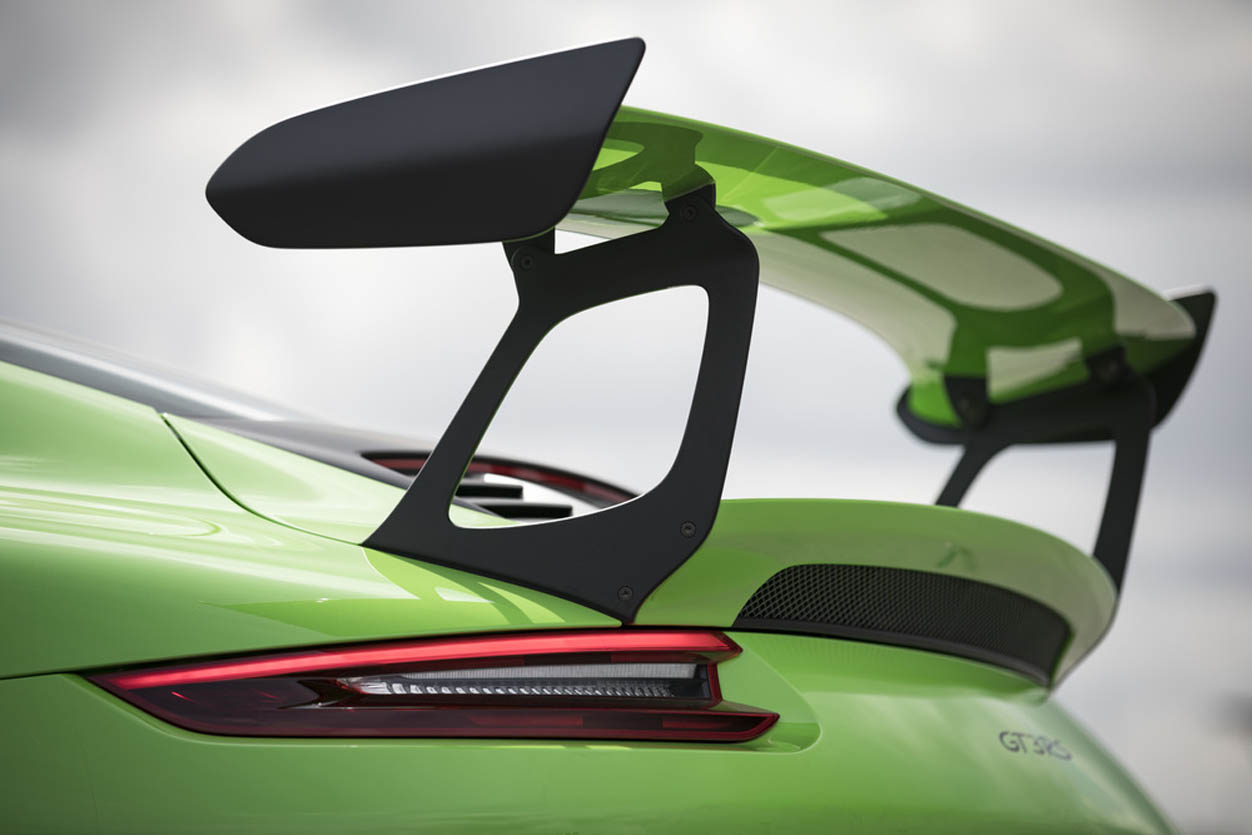 The 911 GT3 RS is one of the few road-approved sports cars with aerodynamics that can be adjusted in the same manner as with a racing car. In order to improve performance on fast bends, the fixed rear wing, with its wing supports made from forged aluminium and painted in black, can be moved into a performance position. In this position, 40 per cent more downforce is generated than with the predecessor model.