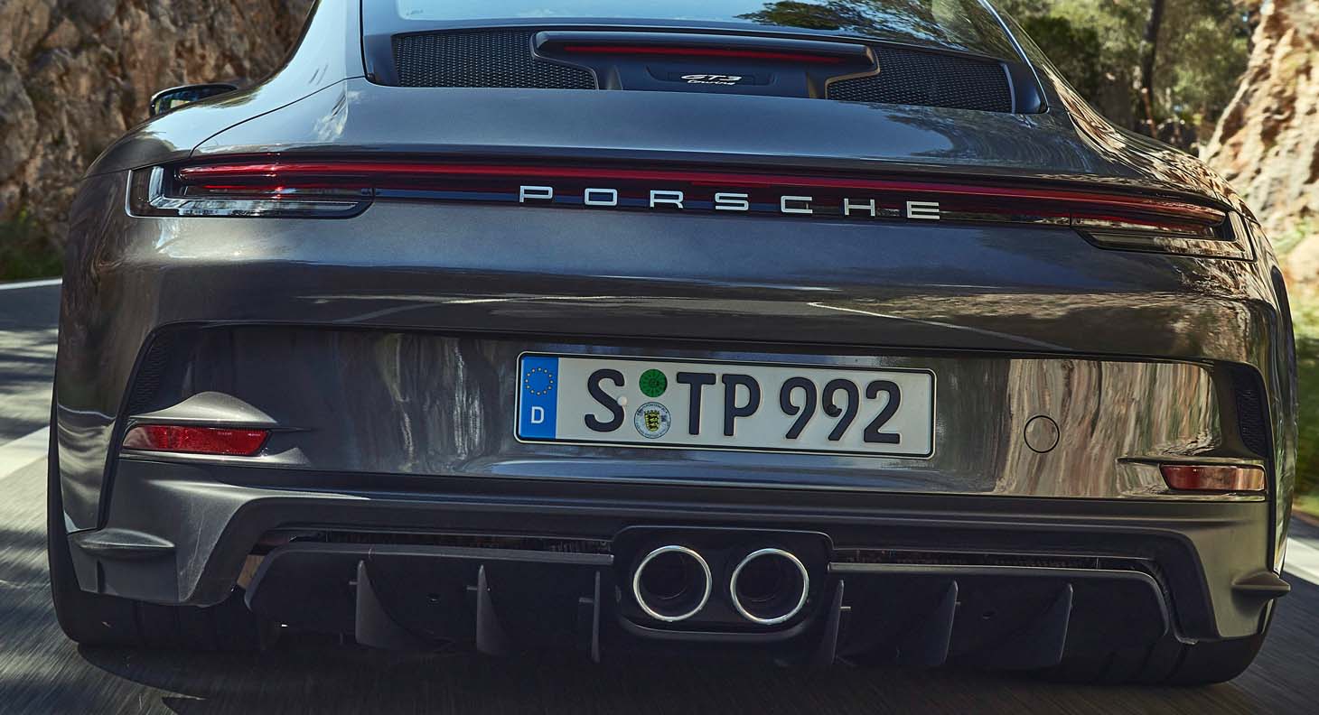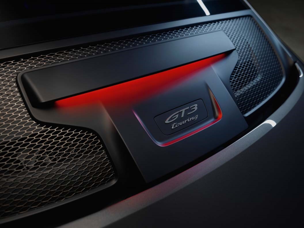 A rear lid grille with the ‘GT3 touring’ logo in unique design is located over the high-revving engine. The trim strips of the side windows and the tailpipes of the sports exhaust system are silver-coloured. These elements are finished in satin-gloss Black in the optional Touring package. The front light modules are dark-tinted in this case.
