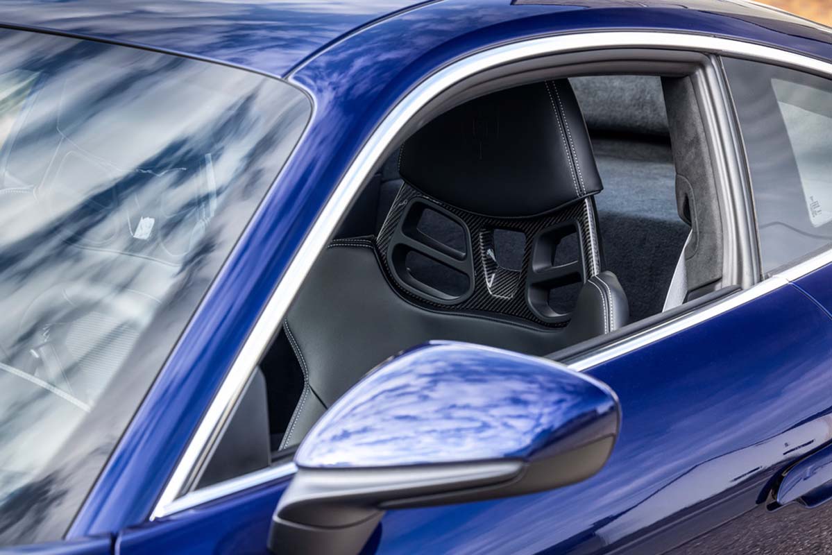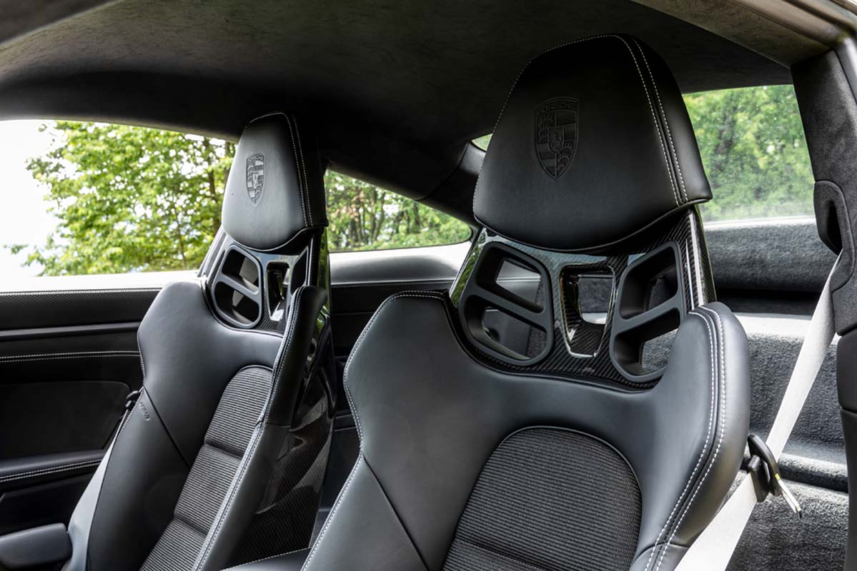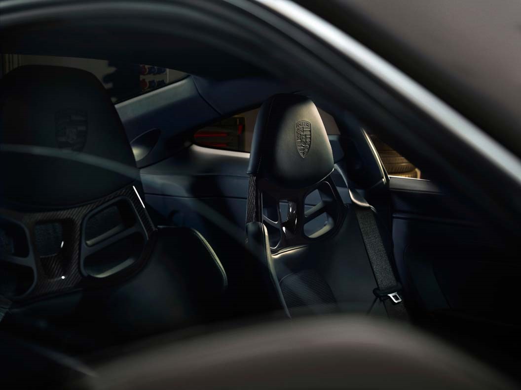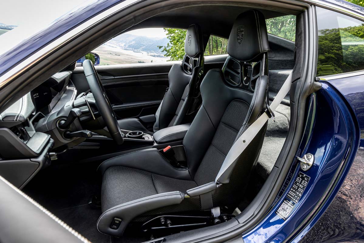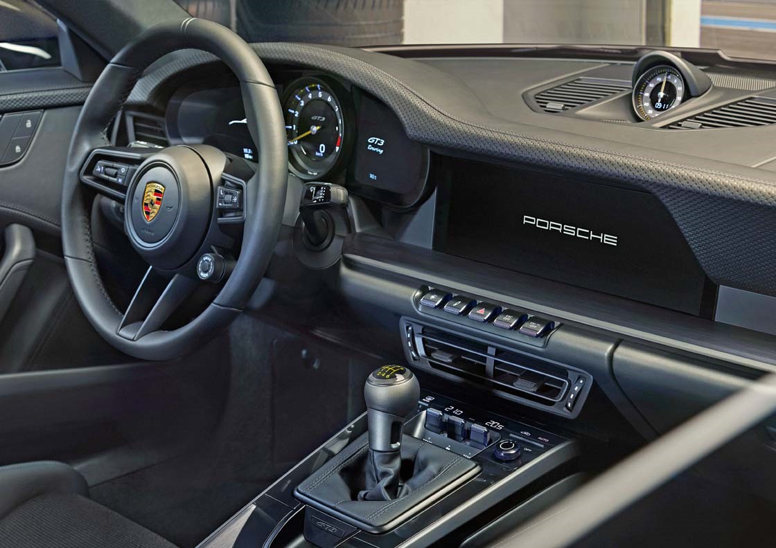 The 911 GT3 with Touring package also offers the atmosphere of a classic sports car in the interior. The steering wheel rim, gear/selector lever, cover of the centre console, armrests in the door panels and the door handles are covered in black leather. The partial leather interior features black stitching. The seat centre panels are covered with black fabric, and the roofliner is also black. The head restraints bear embossed Porsche Crests. The door entry guards and trim elements on the dashboard and centre console are made of brushed black aluminium.