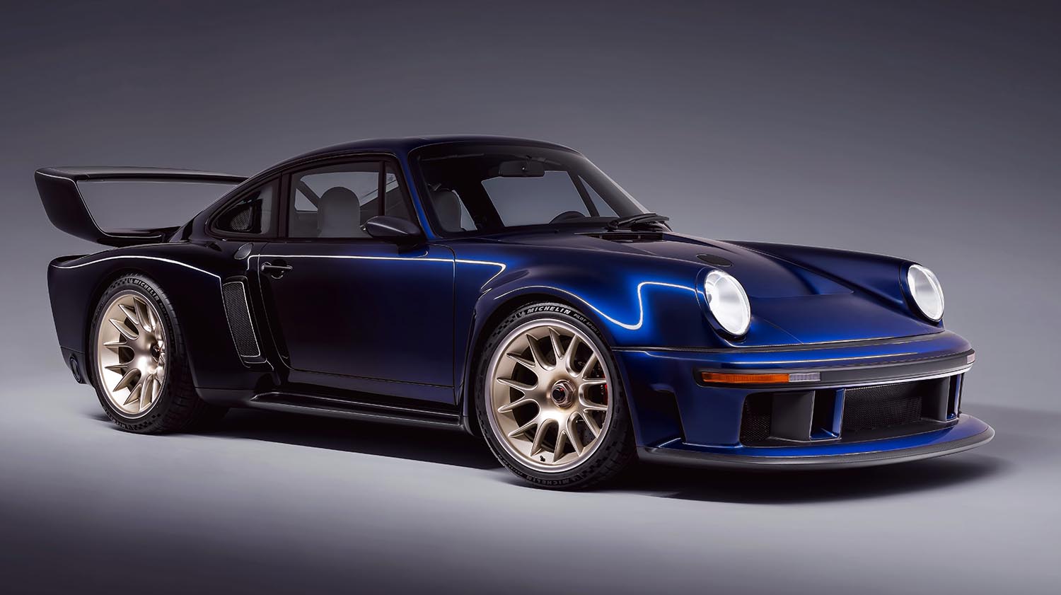 The exterior of this Porsche 911 Reimagined by Singer is a study in functional beauty and high-tech material science. Finished in a graduated Fantasia Blue, the bodywork transitions into a darker shade toward the rear of the car. The owner specified a track-focused configuration, which includes a deep front spoiler and a massive, raised rear wing for maximum downforce. Because the body is constructed entirely from lightweight carbon fiber, the car achieves a level of stiffness and weight reduction that enhances every dynamic response. Computational fluid dynamics analysis helped optimize the cooling paths required for the high-output twin-turbocharged engine. The lower trim features satin carbon fiber, while the upper trim is finished in black anodized aluminum for a stealthy look. Every curve of the bodywork pays homage to Porsche’s racing history while utilizing the latest in modern manufacturing techniques.
