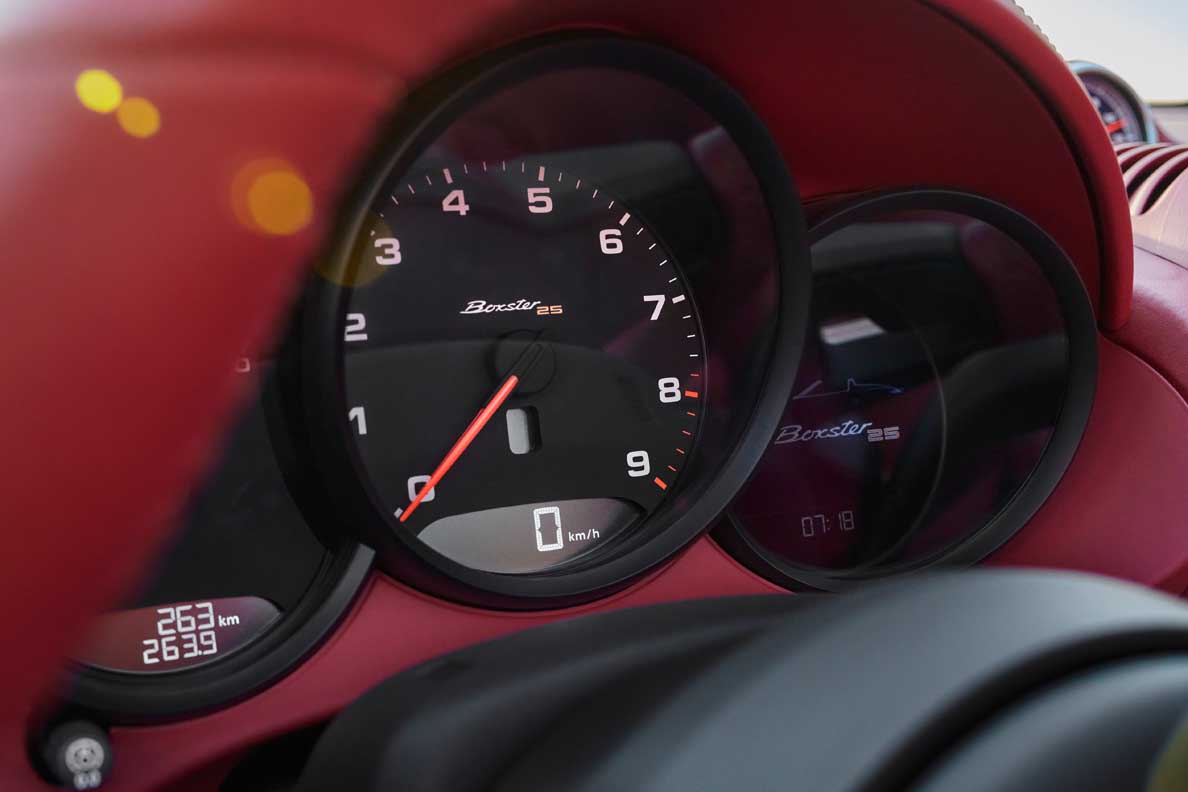 Porsche is offering the Boxster 25 Years with a manual six-speed transmission and a seven-speed Porsche dual-clutch transmission (PDK). The special-edition model reaches a top speed of 293 km/h and, in combination with the PDK gearbox and standard Sport Chrono package, sprints from zero to 100 km/h in four seconds.