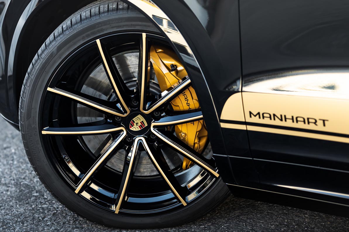 Also accentuated in gold are the shiny black MANHART Five-star double-spoke alloy wheels. They measure 10.5×22 and 11.5×22 inches and are fitted with 285/35ZR22 and 315/30ZR22 tyres.
