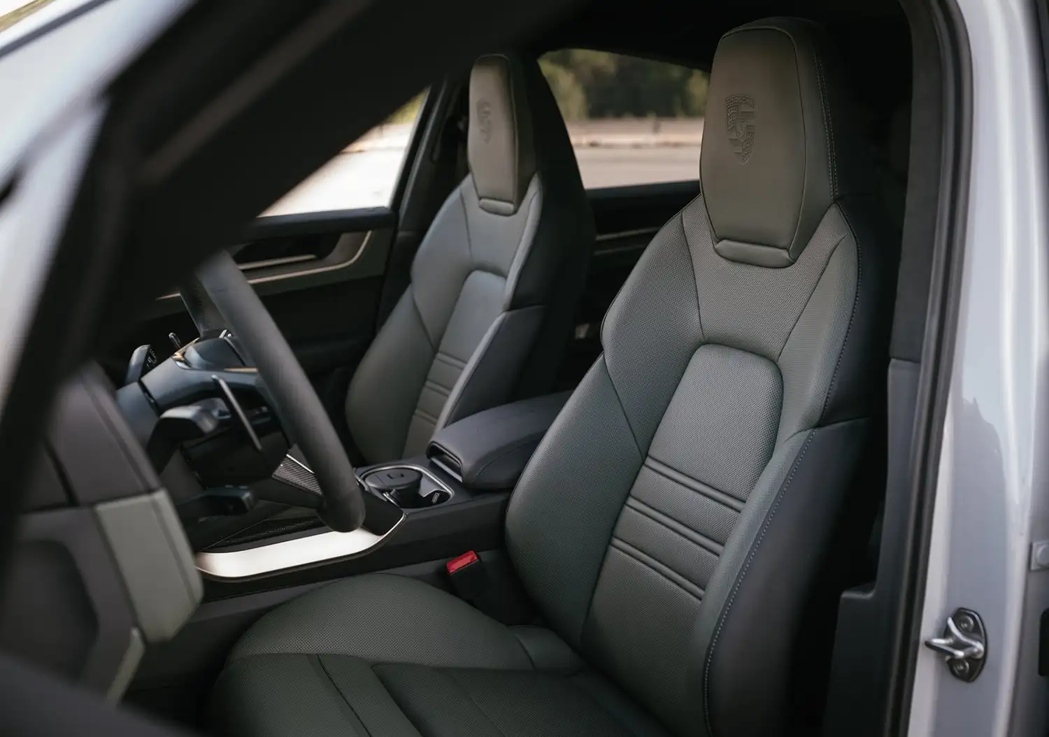 Inside, the most powerful Cayenne underscores its sportiness with aluminium inlays in the dashboard and the door panel trims. The roof lining is made entirely of the particularly sporty Race-Tex microfibre material. The standard equipment also includes a heated GT sports steering wheel, a mode switch for fast and direct selection of the desired driving mode, and 18-way adjustable leather sports seats with the model name embroidered in the headrests. As an alternative to the sports seat, 14-way adjustable leather comfort seats are available. The tachometer with the “Turbo” logo is positioned in the middle of the all-digital dashboard. The high-quality BOSE® Surround Sound system also comes as standard.