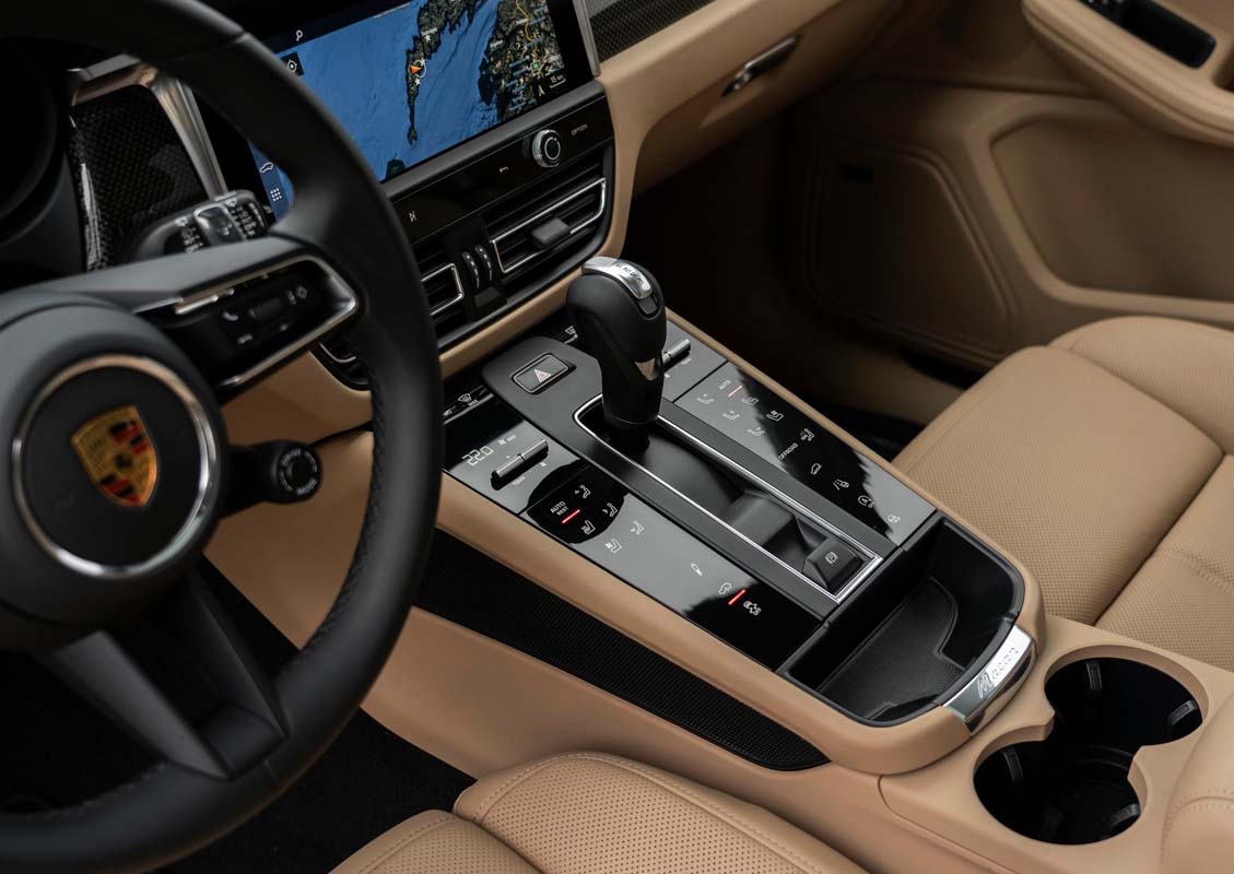 The interior of the Macan has also been extensively revamped. The newly designed centre console is the main focus of the new features. Here, touch-sensitive surfaces replace conventional switches. Clearly arranged and intuitive control panels are located at the sides of the new selector lever, which has been shortened by 15 mm. Below, there is an open stowage compartment, with a larger capacity than before. As before, there is a 10.9-inch full HD touch display above the console – the heart of the Porsche Communication Management (PCM) system. The analogue clock integrated on top of the dashboard is now a standard feature on the new Macan.
