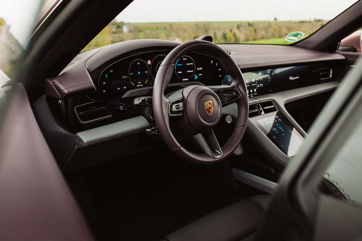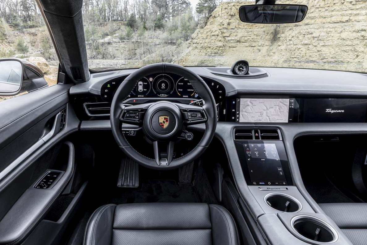 The highly praised design contours familiar from the Taycan sports saloon can be found in the interior: the wing-shaped upper and lower sections of the dashboard stretch across the entire width of the vehicle. The free-standing, curved instrument cluster forms the highest point on the dashboard. A central 10.9-inch infotainment display and a further, optional, front passenger display are combined to form an integrated glass band in a black-panel look. A compass is installed on the top of the dashboard in combination with the Off-Road Design package.