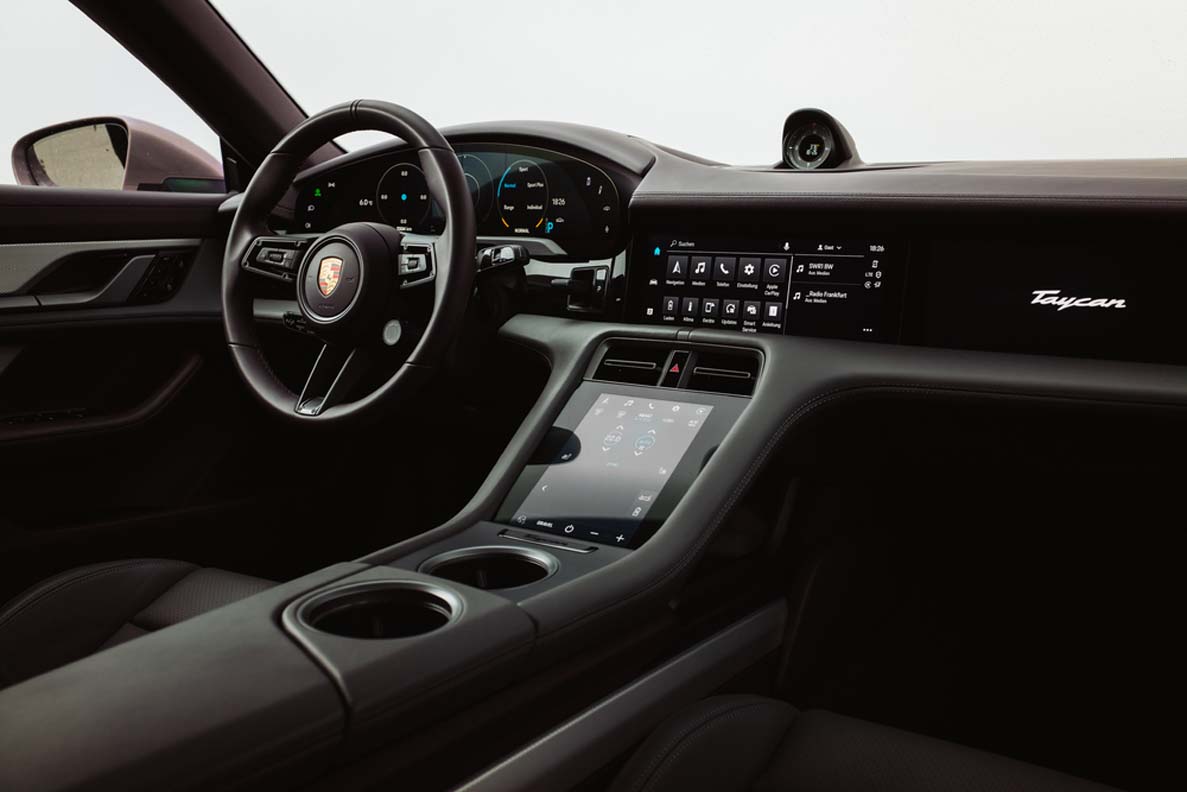 The highly praised design contours familiar from the Taycan sports saloon can also be found in the new variant’s interior: the wing-shaped upper and lower sections of the dashboard stretch across the entire width of the vehicle. The free-standing, curved instrument cluster forms the highest point on the dashboard. A central 10.9-inch infotainment display and a further, optional front passenger display are combined to form an integrated glass band in a black-panel look.