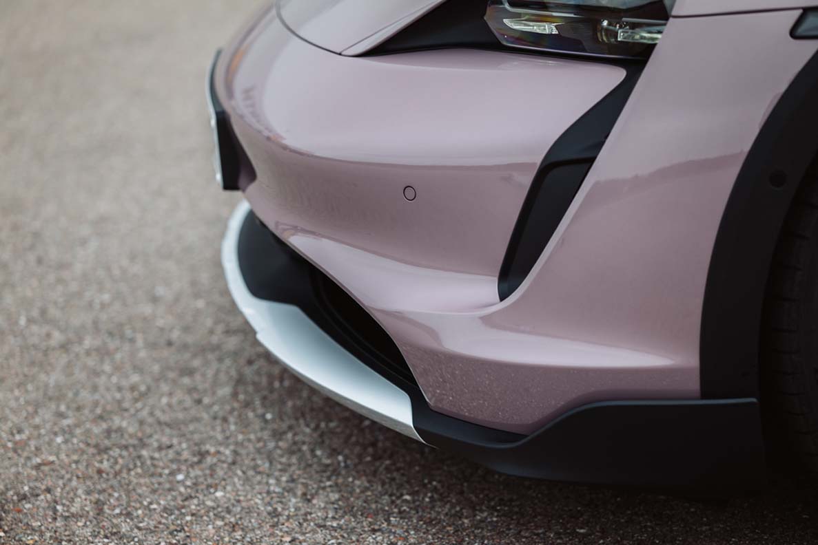 The front end is characterised by the Cross Turismo-specific front apron. On the Porsche Taycan Turbo S Cross Turismo, the inlay is finished in carbon as standard. The inlays on the other models are painted in Brilliant Silver. The front apron is optionally also available in Vesuvius Grey or High-Gloss Black.