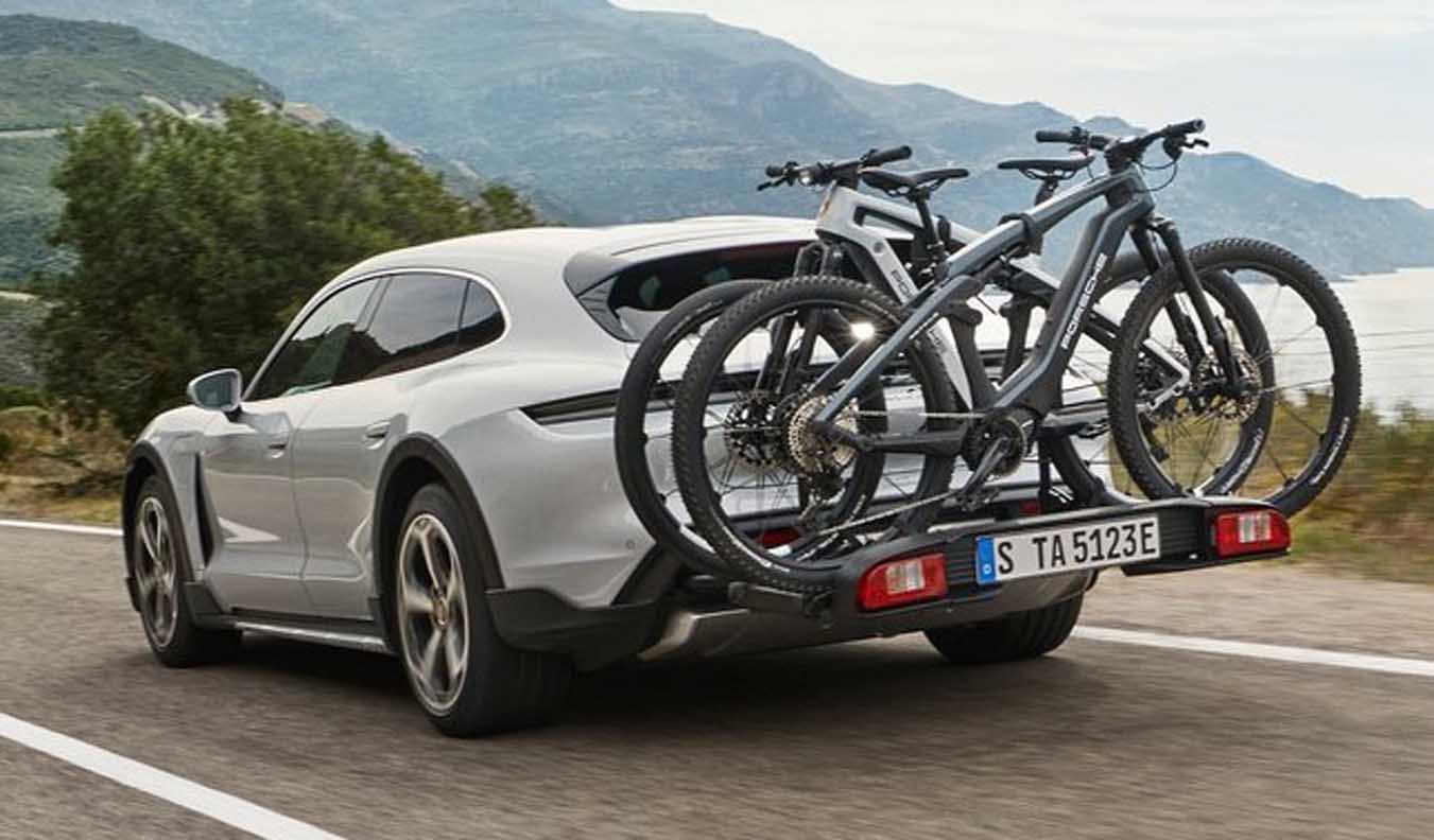 The new rear bicycle carrier designed by Porsche especially for this model also underwent the rigorous testing programme with rough road tracks and driving dynamics tests. The carrier sets new standards not just in terms of stability, but also in ease of use and ergonomic design. Several (e-)bikes can be transported on its very wide and generously spaced rails.