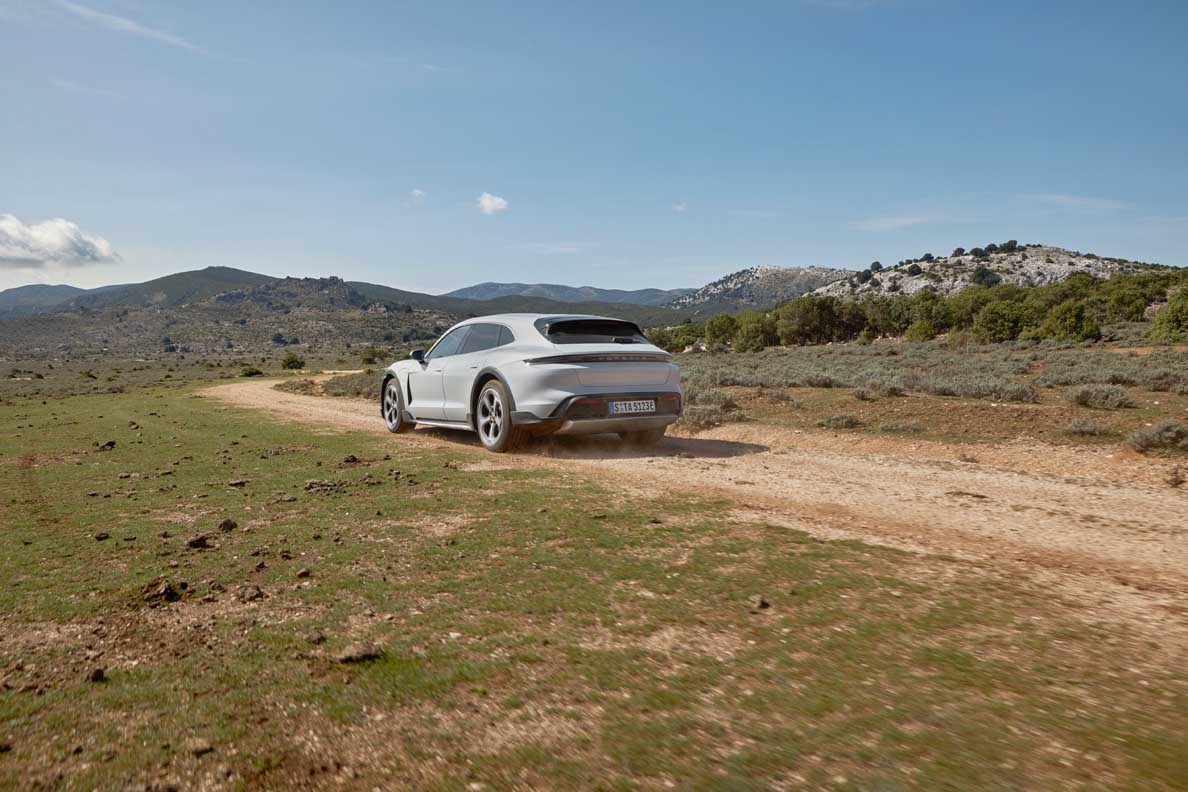The Porsche Taycan Cross Turismo is the first all-electric Cross Utility Vehicle (CUV). Its potential to drive both on- and off-road are clearly signalled by its ride . The Taycan Cross Turismo is approximately 30 mm higher off the ground than the Taycan saloon.