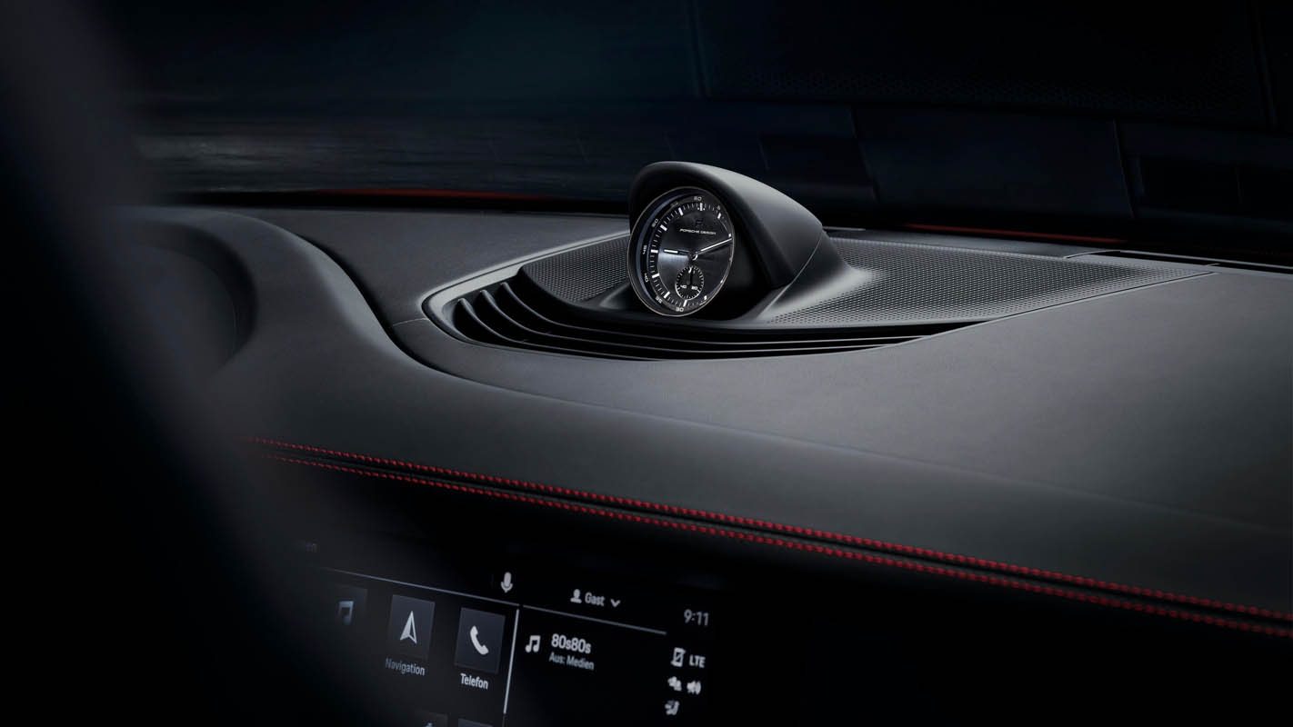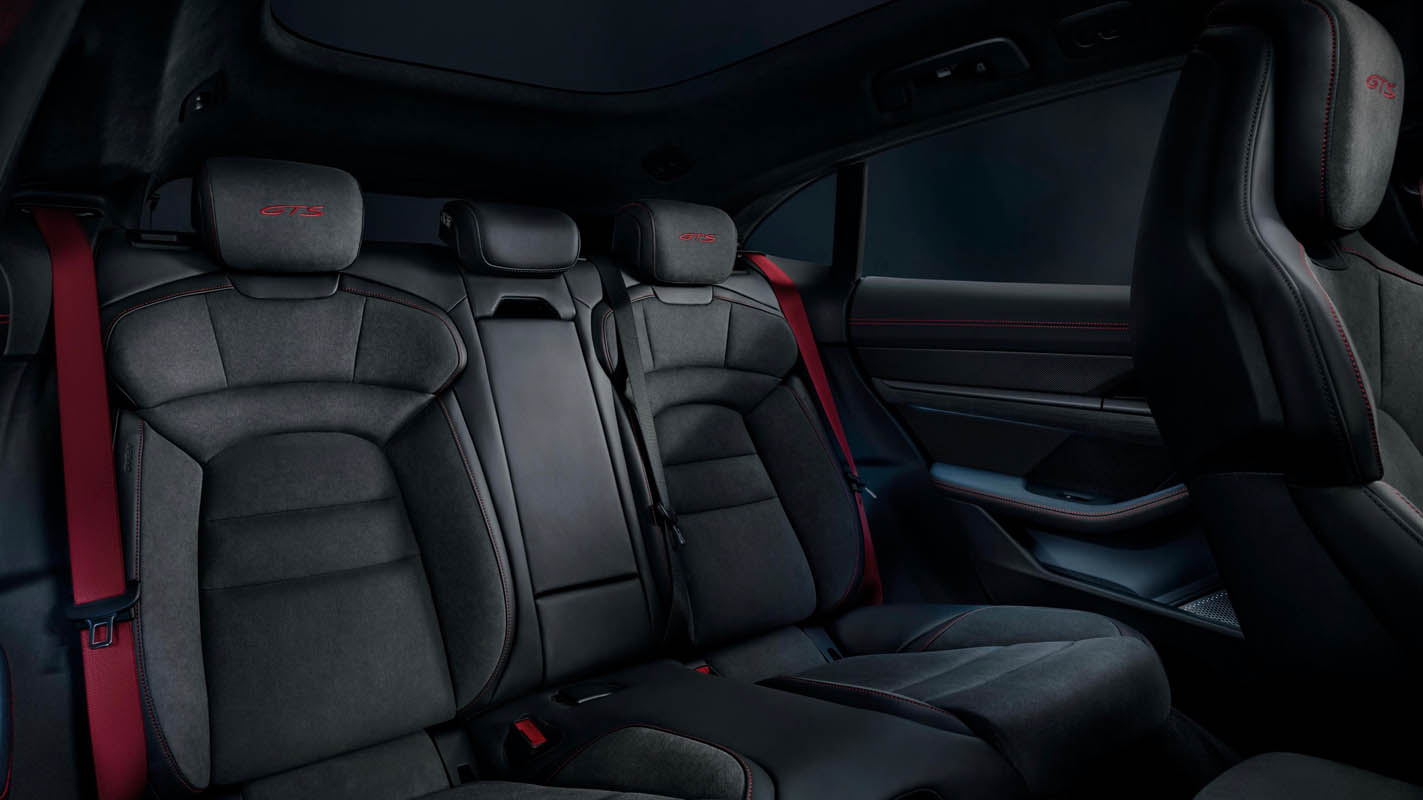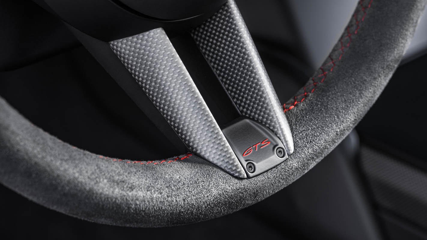 The exterior and interior are distinctive. There are numerous Black or dark details on the exterior, such as the front apron, the bases of the exterior mirrors and the side window trims – as is traditional on a GTS. Numerous Black Race-Tex features in the interior underscore the elegant, dynamic ambience, as does the standard brushed aluminium interior package with Black anodised finish.