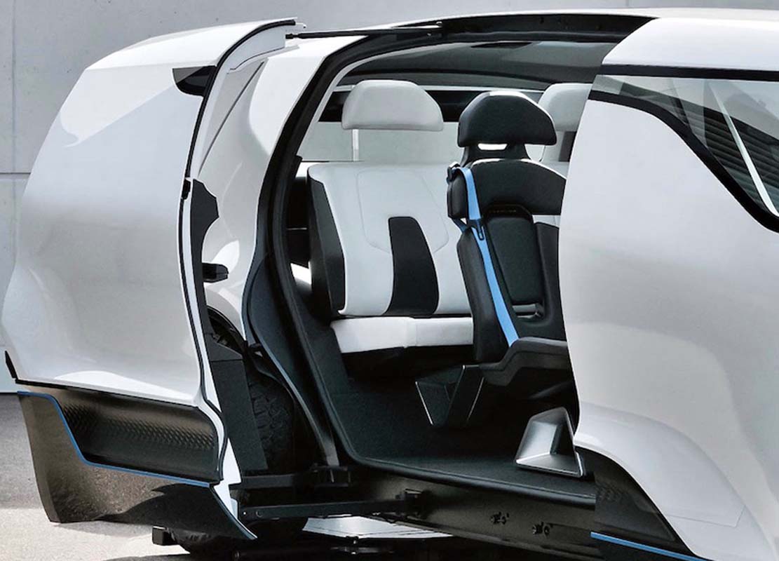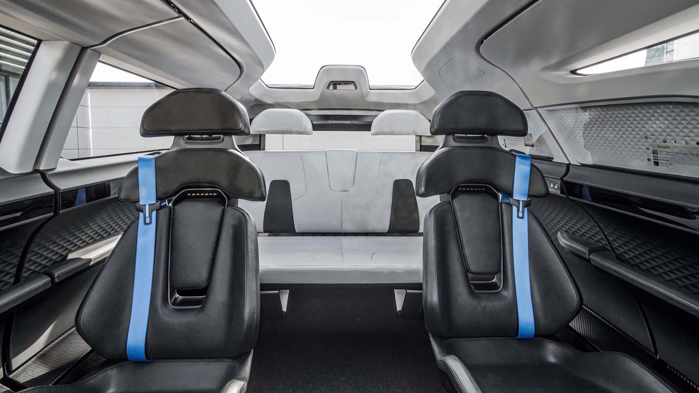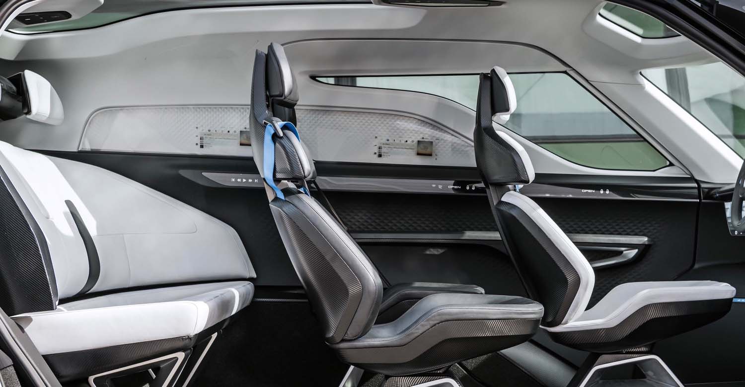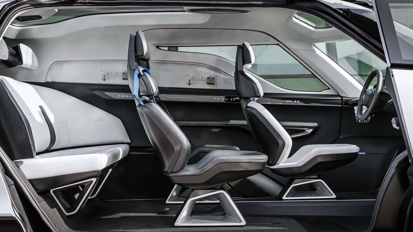 The side windows are designed asymmetrically. “One side is closed; passengers can retreat there,” explains interior design chief Auerbach. “The other side enjoys a large window bank for an unobstructed view outside. When we close the doors, the interior feels like a protective capsule.” A feeling of security and comfort dominates the modular interior. The passengers in the first row sit offset to the right and left in ergonomically shaped bucket seats. They can enjoy an unobstructed view of the road ahead and of their own dashboard screens. The rear seat headrests are installed in a floating position, which allows a clear view through the rear window. The luxury of adaptable space is made possible by the powertrain: fully electric and hidden in the underbody.