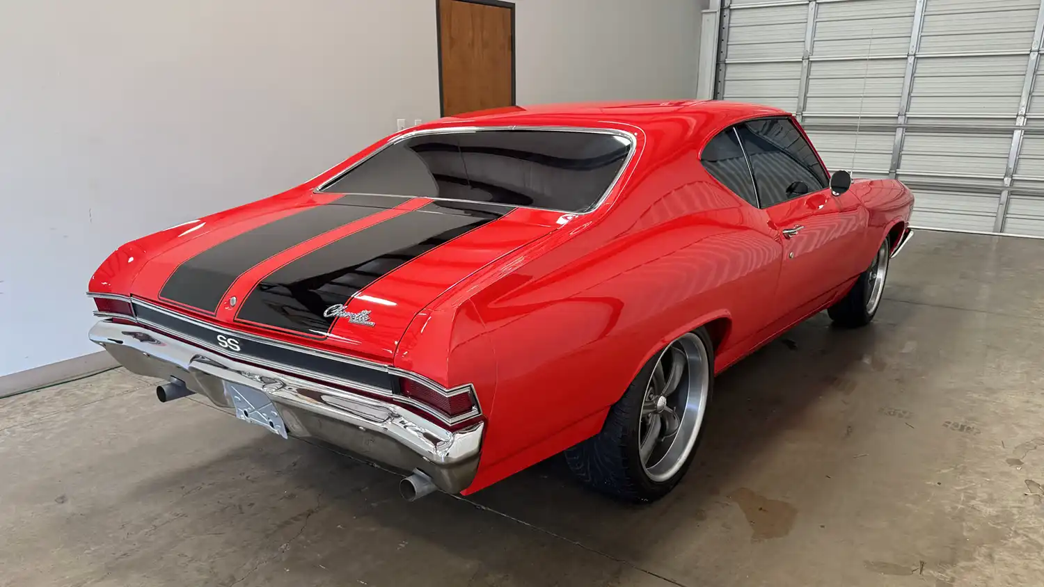 The exterior of this 1969 Chevrolet Chevelle is finished in a vibrant red. This bold color highlights its muscular lines. Contrasting black stripes add to its aggressive, pro-touring look. This combination creates a visually stunning presence. The car rides on staggered 18-inch and 20-inch Boss custom wheels. These wheels perfectly complement its performance stance.