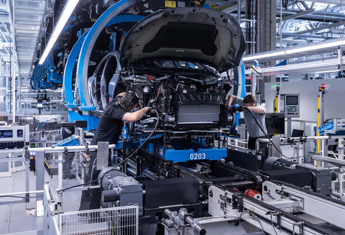 The MO360 digital ecosystem forms the basis for production. The entire digitalisation strategy with its focus on people aims to provide the best possible support for the more than 1500 employees at Factory 56 in their daily work. Having the right qualifications plays an important role, especially when handling high-voltage technology. The employees in vehicle production therefore received intense training.