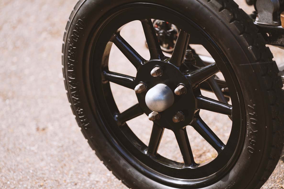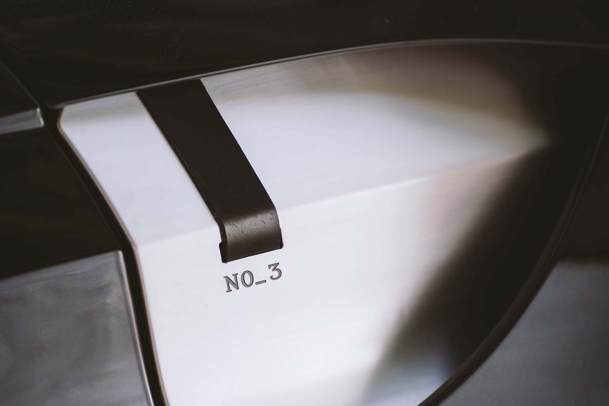 Unique side fender panels fixed with a saddle leather strap take design inspiration from the exposed aluminium bonnet and bonnet strap seen on the 1921 car. The hand polished panel has been painstakingly finished by Ecurie Bertelli, the leading specialist in pre-war Aston Martin models. Adding to this design is the engraved ‘No 3’ as a representation of the stamping seen on the original. Additionally, the exclusive specification also features a set of bronze brake calipers, representing the bronze detailing on ‘A3’, whilst also complementing the bespoke 20-Inch Lightweight Forged Gloss Black wheels.
