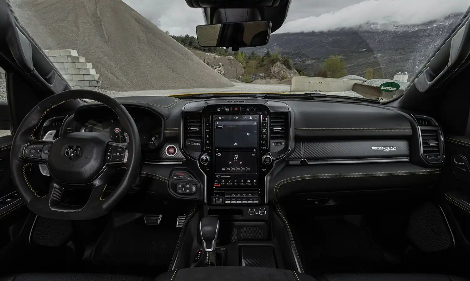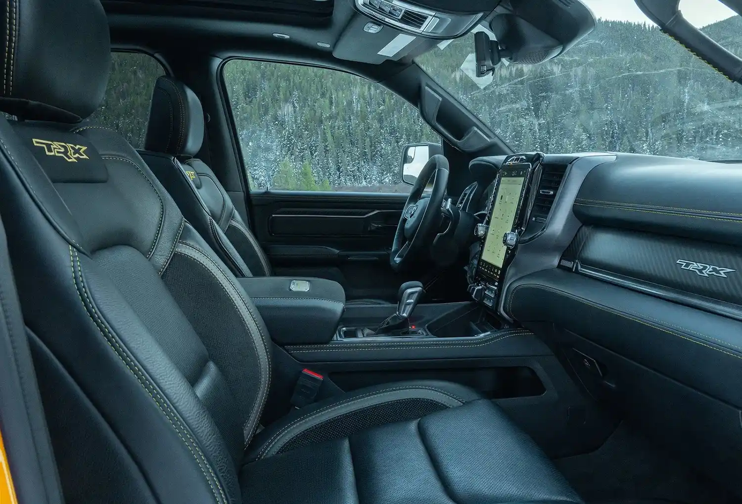 The Ram 1500 TRX Havoc Edition enhances the well-appointed TRX Level 2 Equipment Group and includes a unique Baja Yellow exterior color, graphics and 18-inch all black bead lock capable wheels, dual pane panoramic sunroof, spray-in bedliner, adjustable cargo tie down hooks, deployable bed step and an LED cab-mounted brake light. Inside, the TRX Havoc Edition includes Prowler Yellow accent stitching, an embroidered “TRX” seat back logo, unique carbon fiber accents, a leather and carbon fiber flat–bottom steering wheel, unique center console badge, Head-up Display and a driver’s screen that features TRX in Baja Yellow. Safety features include adaptive cruise control, Lane Keep Assist and pedestrian emergency braking.