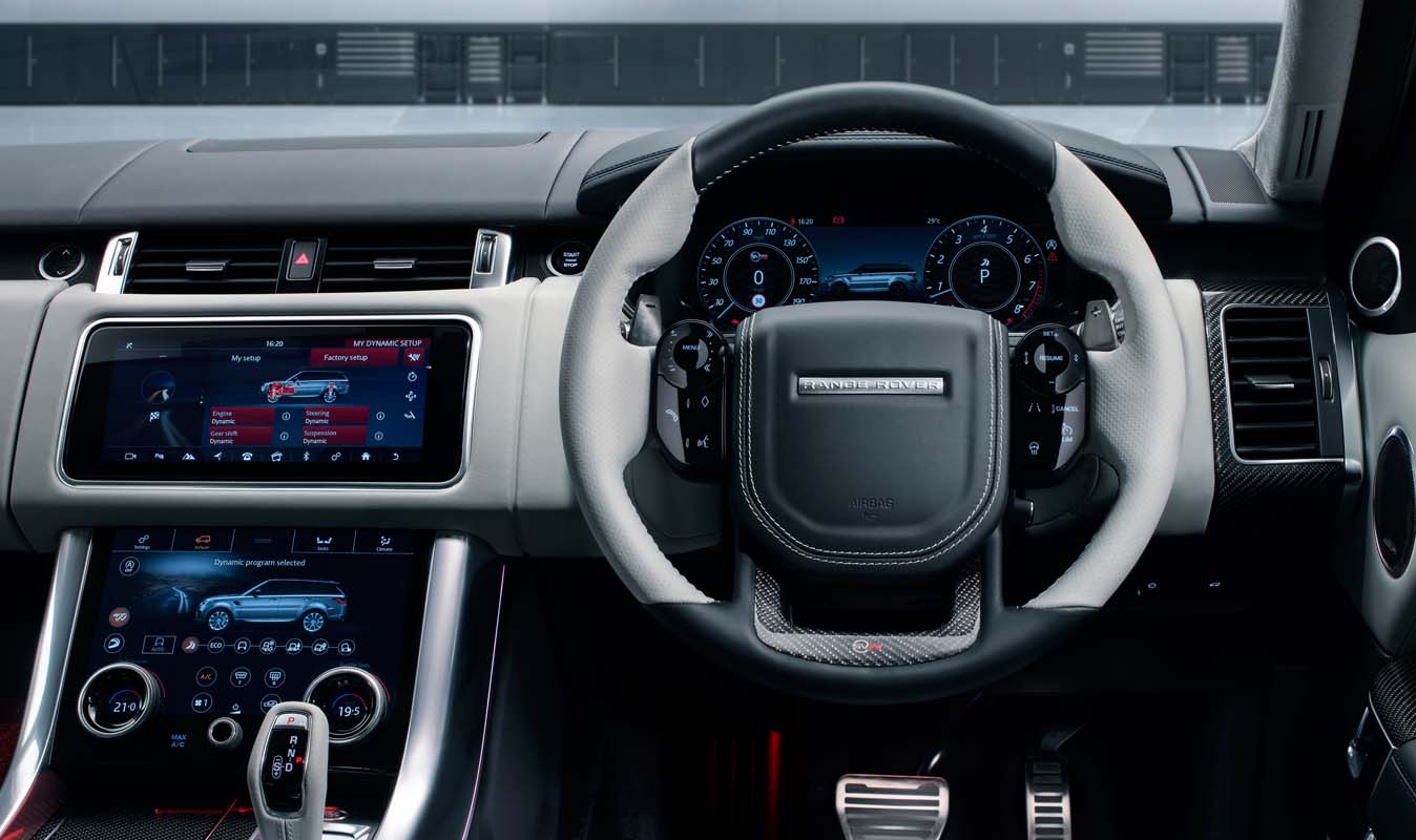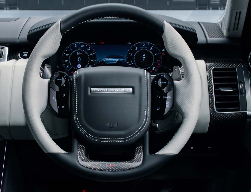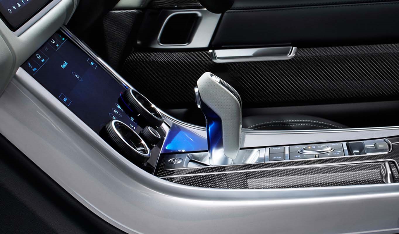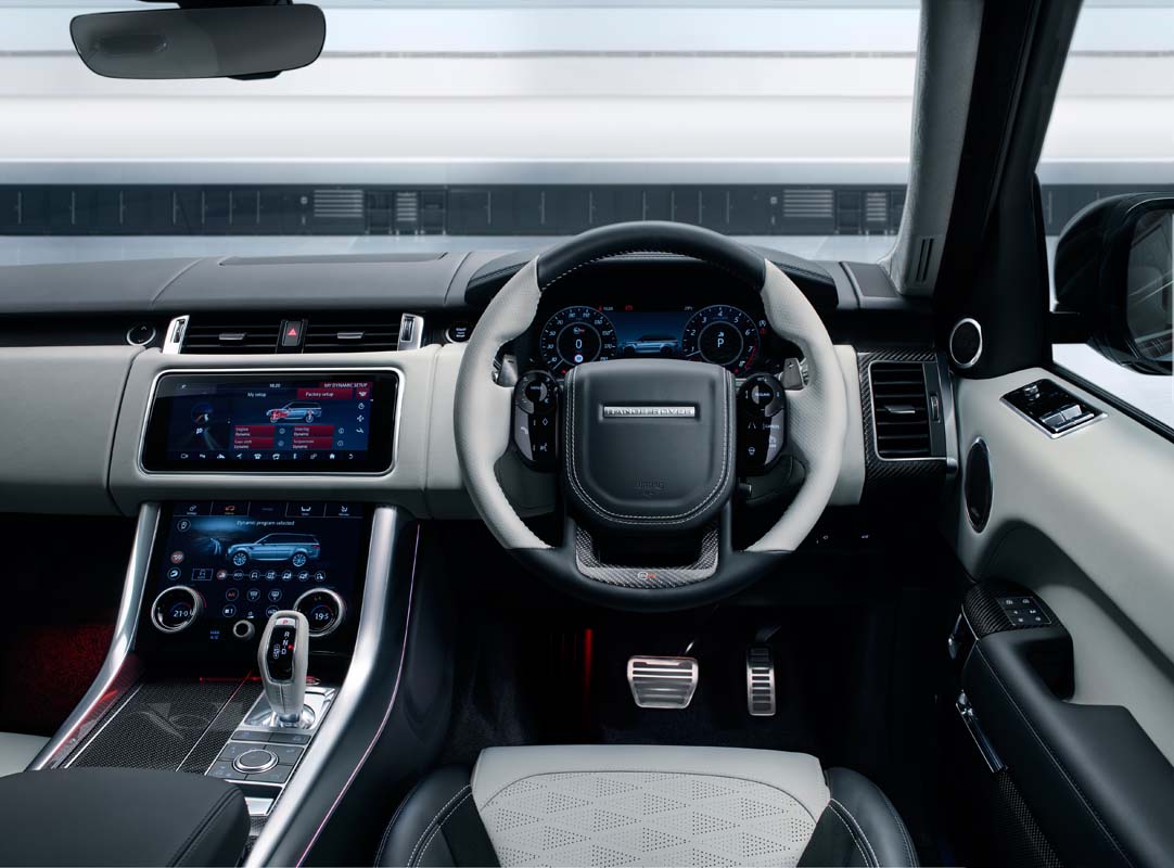 The craftsmanship of the SV Bespoke team is also evident inside. Specially commissioned chrome-finished SV Bespoke B-pillar badges, black anodised metal gearshift paddles and Ultimate edition illuminated treadplates enhance the recommended Ebony and Cirrus interior, which incorporates SVR-embossed lightweight Performance Seats in Windsor leather and contrasting Suedecloth.