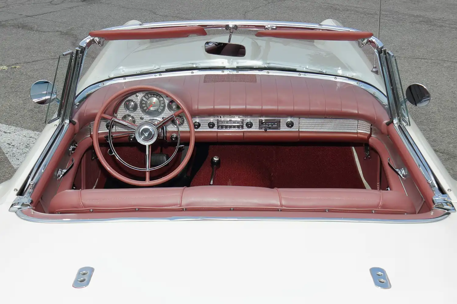 This 1957 Ford Thunderbird E-Code Convertible boasts a powerful 312/271 HP V-8 engine paired with a Ford-O-Matic automatic transmission, delivering a smooth yet thrilling driving experience. The vehicle’s exterior is finished in the original Colonial White, complemented by a new white soft top and a classic porthole hardtop. Inside, the Thunderbird features a luxurious factory-pleated Bronze interior, adding a touch of elegance to its sporty design.