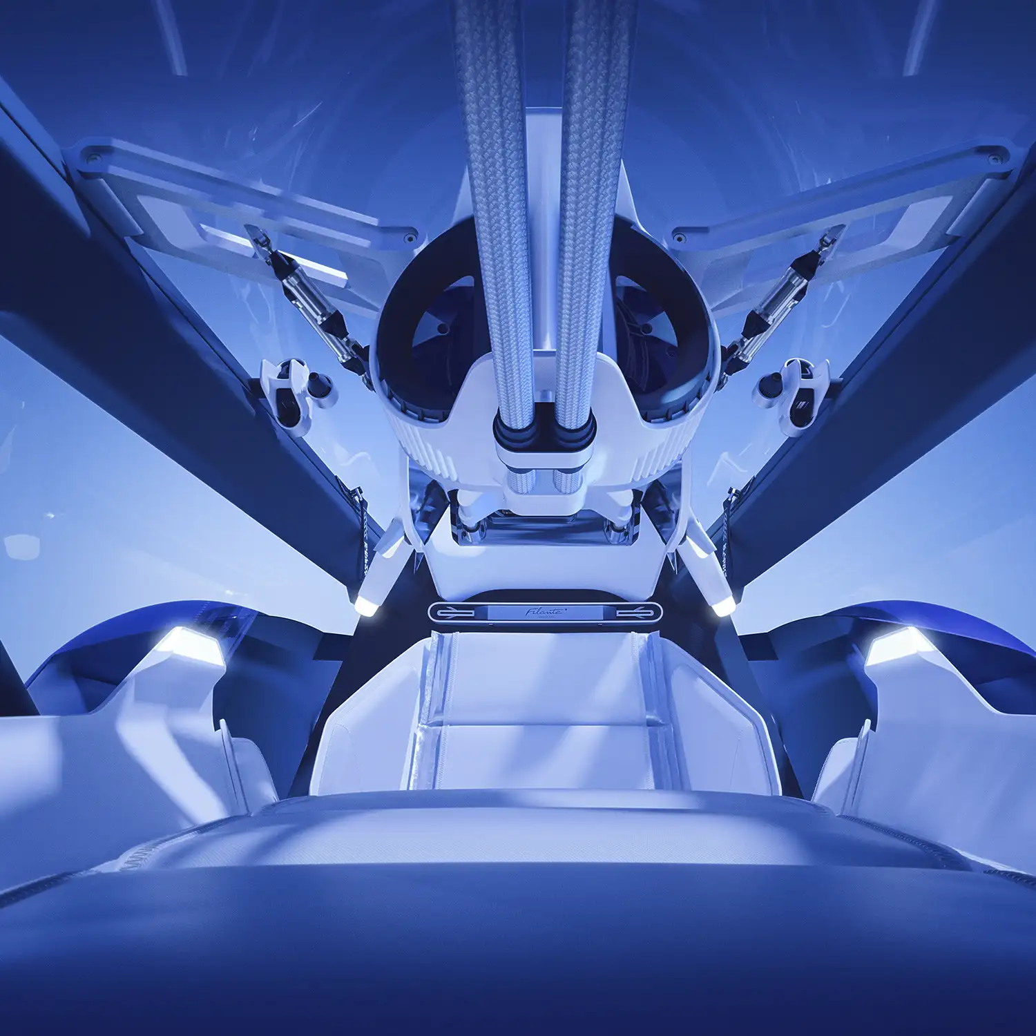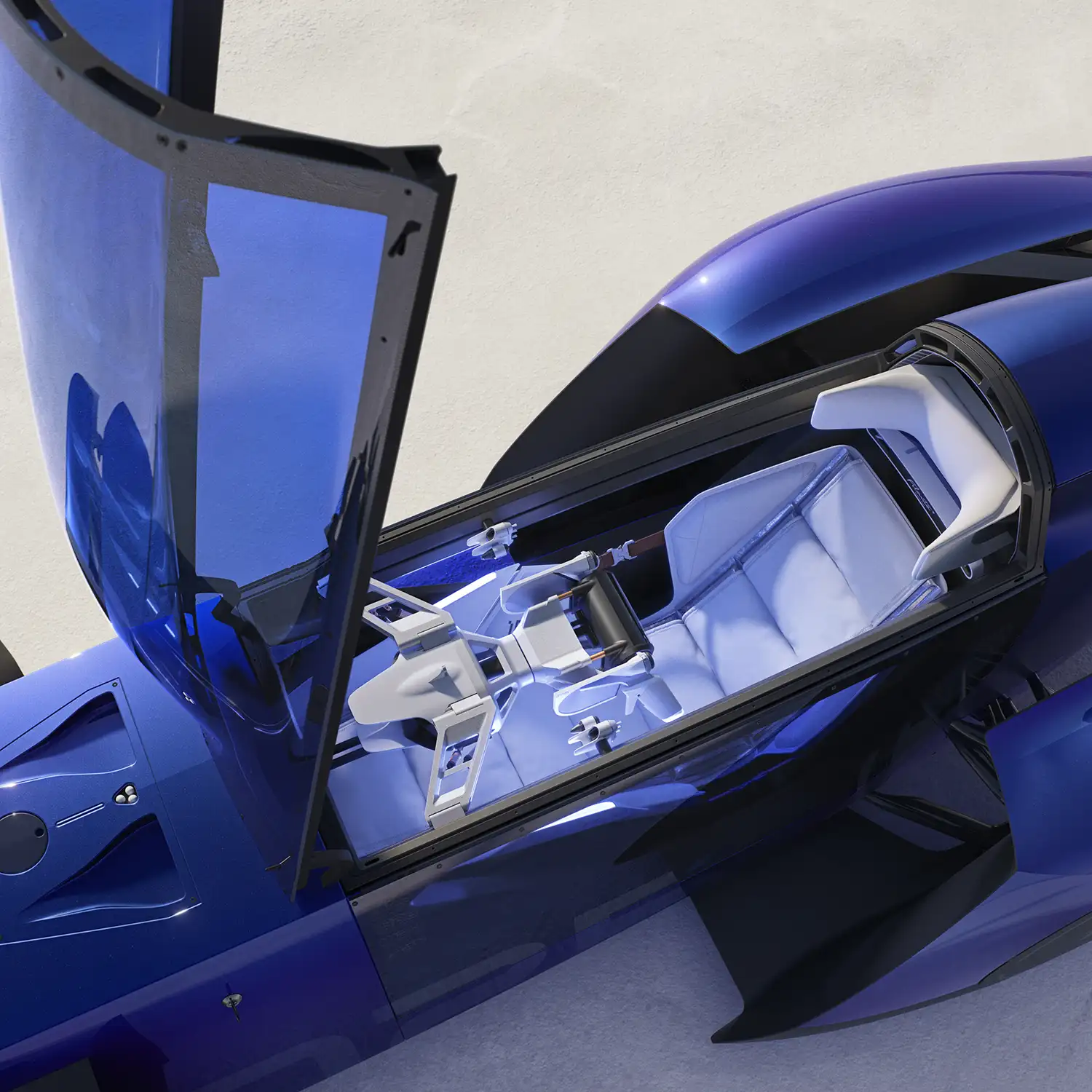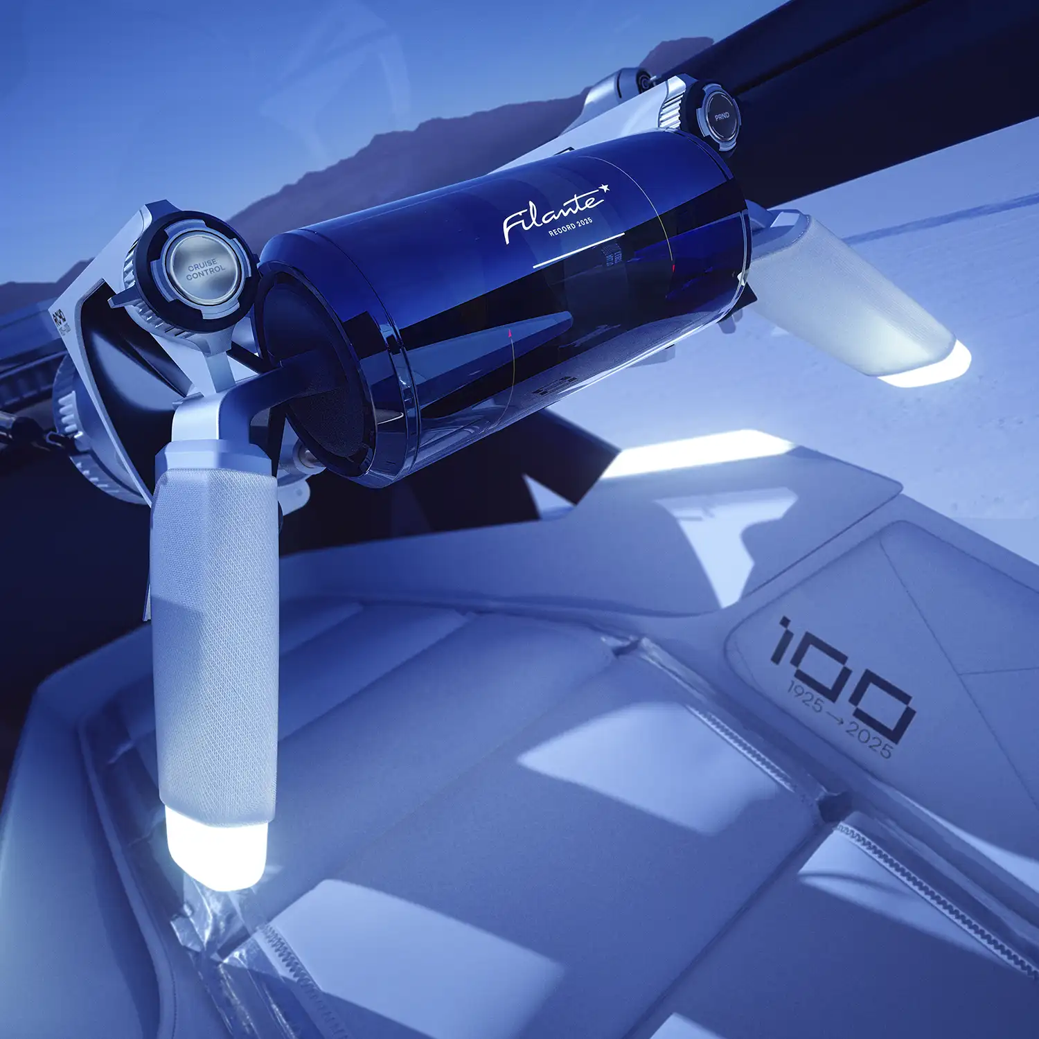 The interior of the Filante Record 2025 is as focused on performance as its exterior. Inspired by aviation and space travel, the cockpit is a minimalist environment where every component is designed for maximum efficiency and driver comfort. The driver’s seat, made from stretched canvas and carbon blades, molds to the body for optimal support. All essential controls are within easy reach, and information is displayed on an ultra-thin digital screen. The innovative steering wheel, incorporating steer-by-wire and brake-by-wire technologies, controls acceleration, braking, and steering through a 3D-printed Scalmalloy structure. A flexible panoramic screen at the center of the steering wheel displays crucial data like speed, range, and driving parameters. Even the air circulation system is designed for efficiency, minimizing weight and energy consumption. The F1-inspired driving position optimizes ergonomics and visibility.