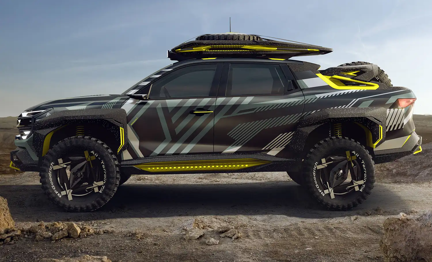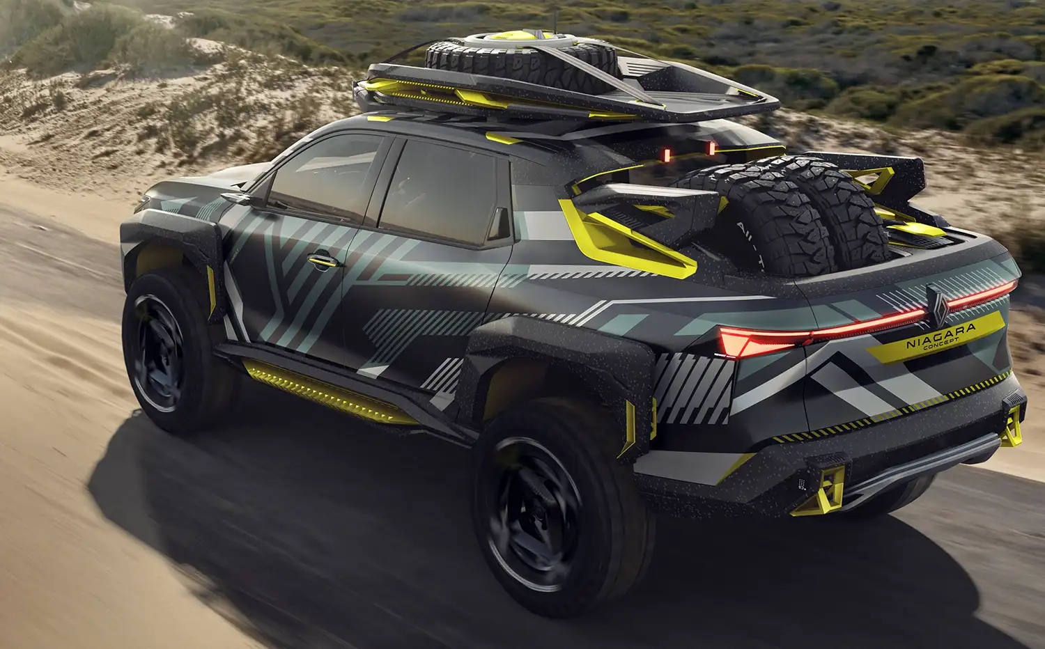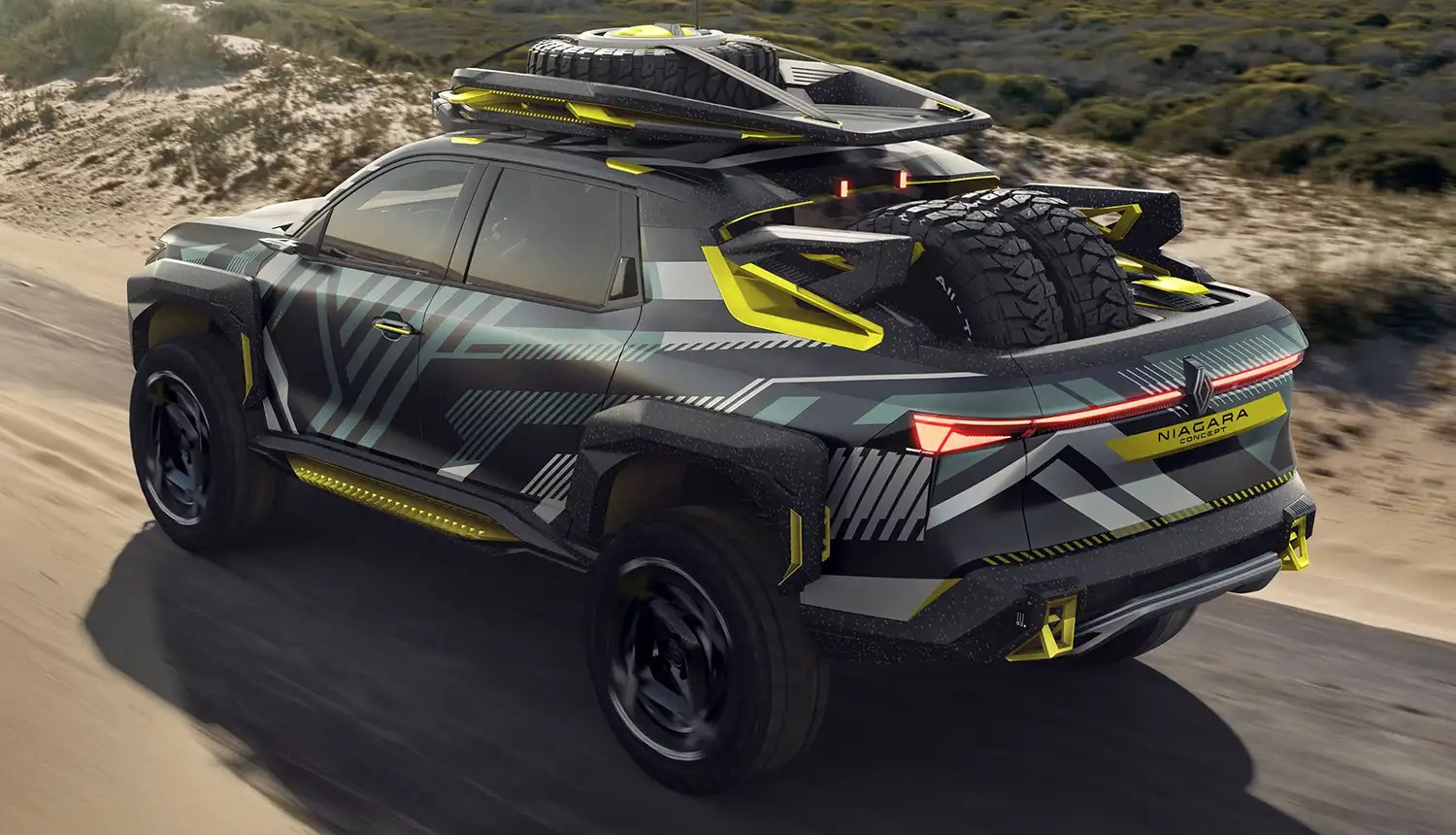 Niagara Concept is covered with a camouflage inspired by the lines and patterns of the brand’s logo. The colours underscore the vehicle’s multiple facets: the green points for adventure, yellow for its sports-car edge, light grey for technicity and the black background for power.