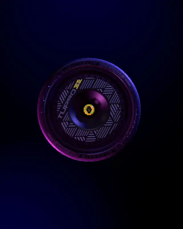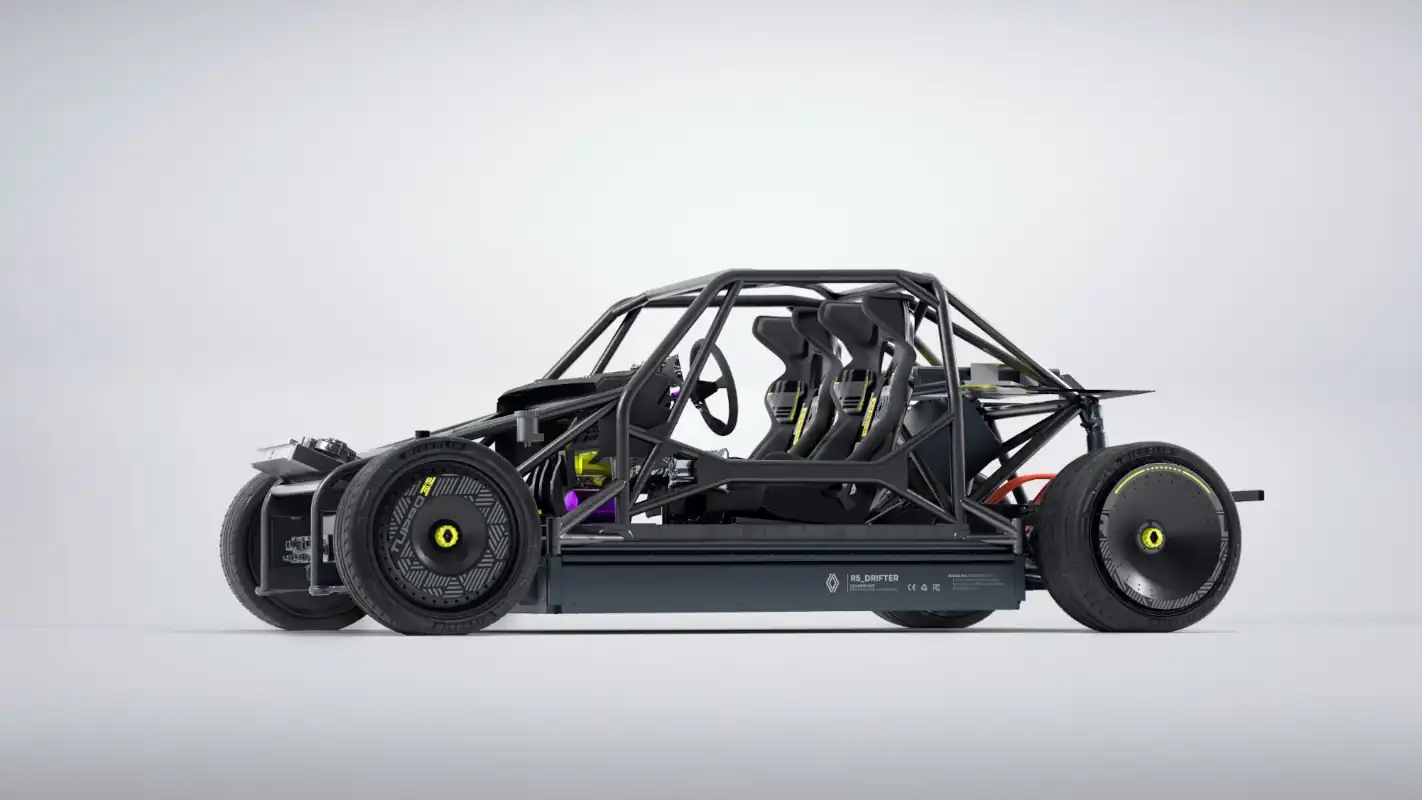 The carbon fibre racing bucket seats, safety harness and steering wheel are the result of teamwork with Sabelt1 . The imposing upright handbrake lever – a drifter car mainstay – in the middle of the centre console that is eminently “pop” yellow. The same yellow intertwines with pink to add sparkle to the grey and black tartan – a tip of the hat to the 1980s – on the seats and dashboard. The tartan in turn produces a visual effect based on the Renault logo. There is also a logo – which lights up this time – on the steering wheel hub. All these colourful touches also contrast with the black cork floor and Alcantara lines the top of the dashboard and the door panels.