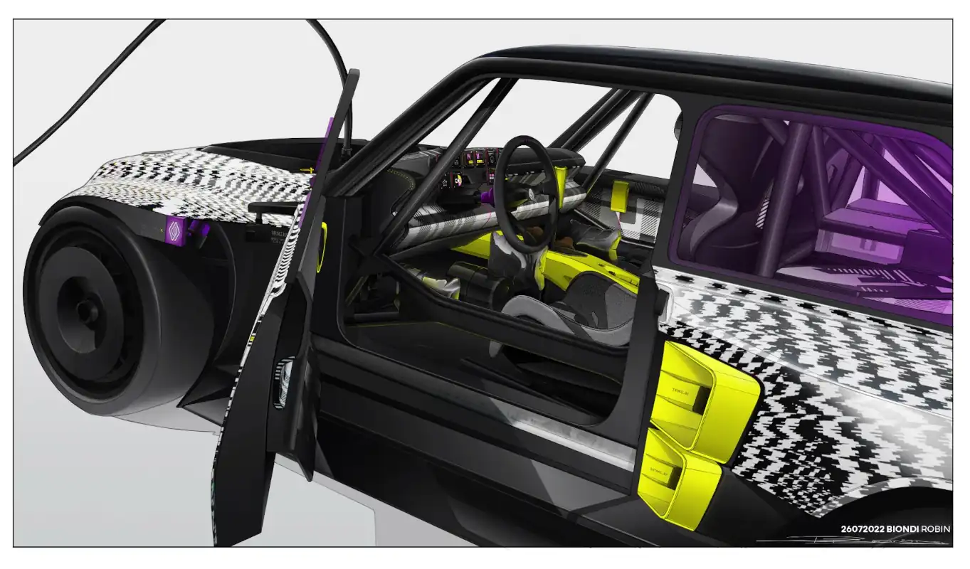 Inside the Renault R5 TURBO 3E show car, the mood is a present-day and cheerful combination of hallmarks from motorsports, videogames and, of course, the Renault 5 and Renault 5 Turbo 2 icons and their time.