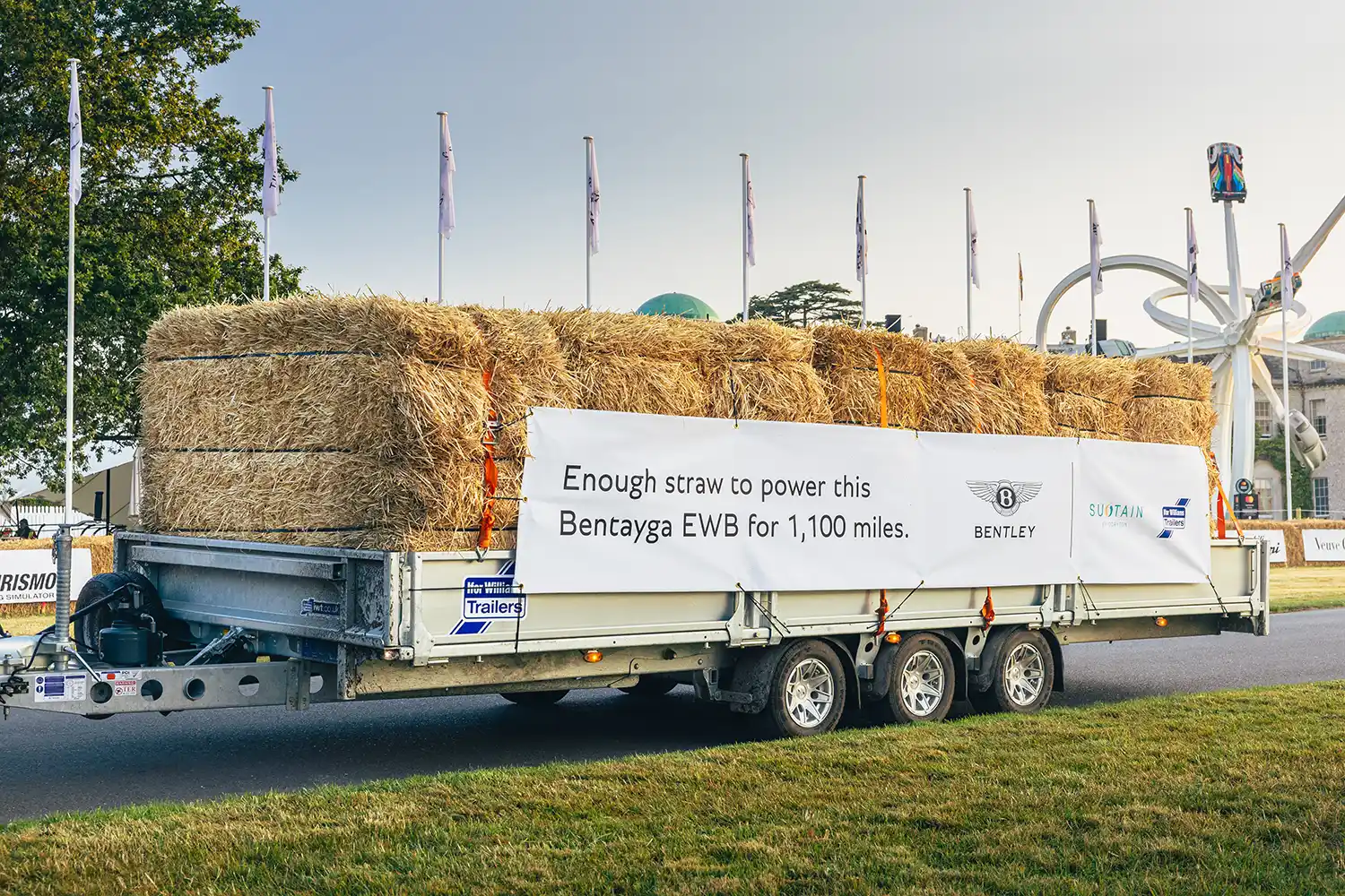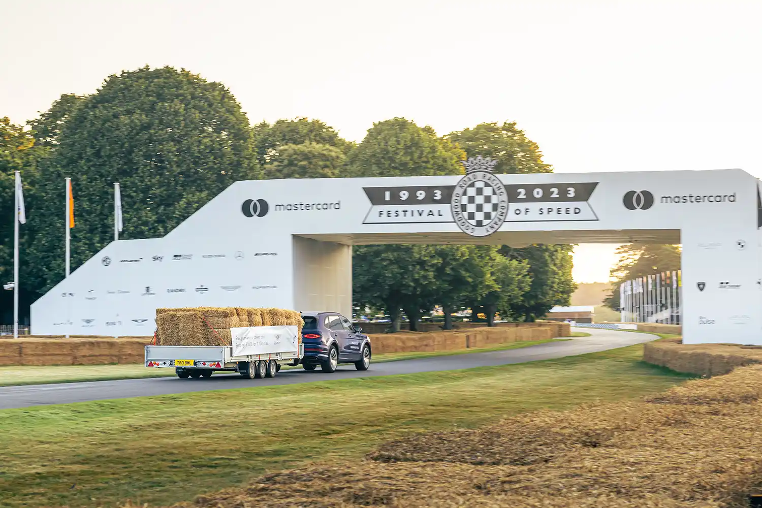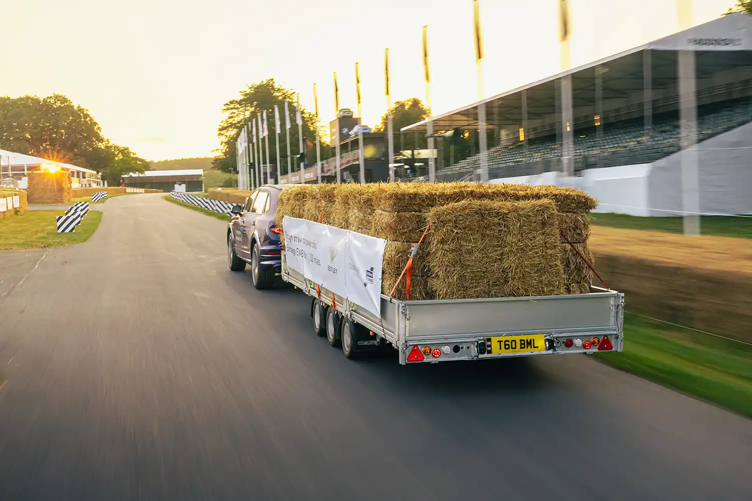 Bentley’s renewably-powered showcase at Goodwood Festival of Speed was opened in dramatic fashion this morning, with the announcement of a new, albeit unofficial, hillclimb record – fastest car with a trailer. A Bentayga EWB, Bentley’s newest flagship, completed the hill climb at speed in just 1 minute 21 seconds – impressive enough, but made even more surprising by the fact it was towing 2.5 tonnes of straw in a specially-prepared Ifor Williams trailer.