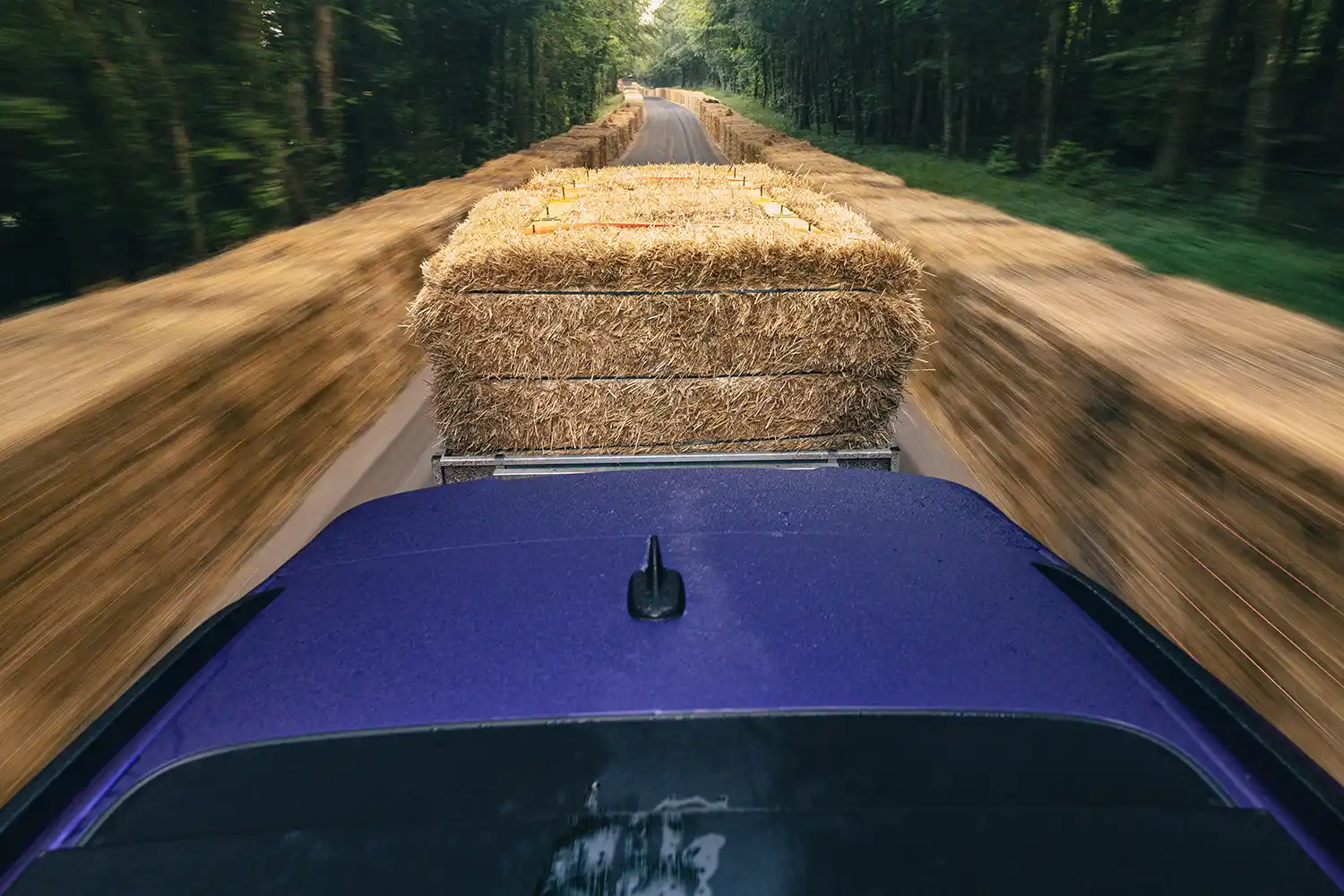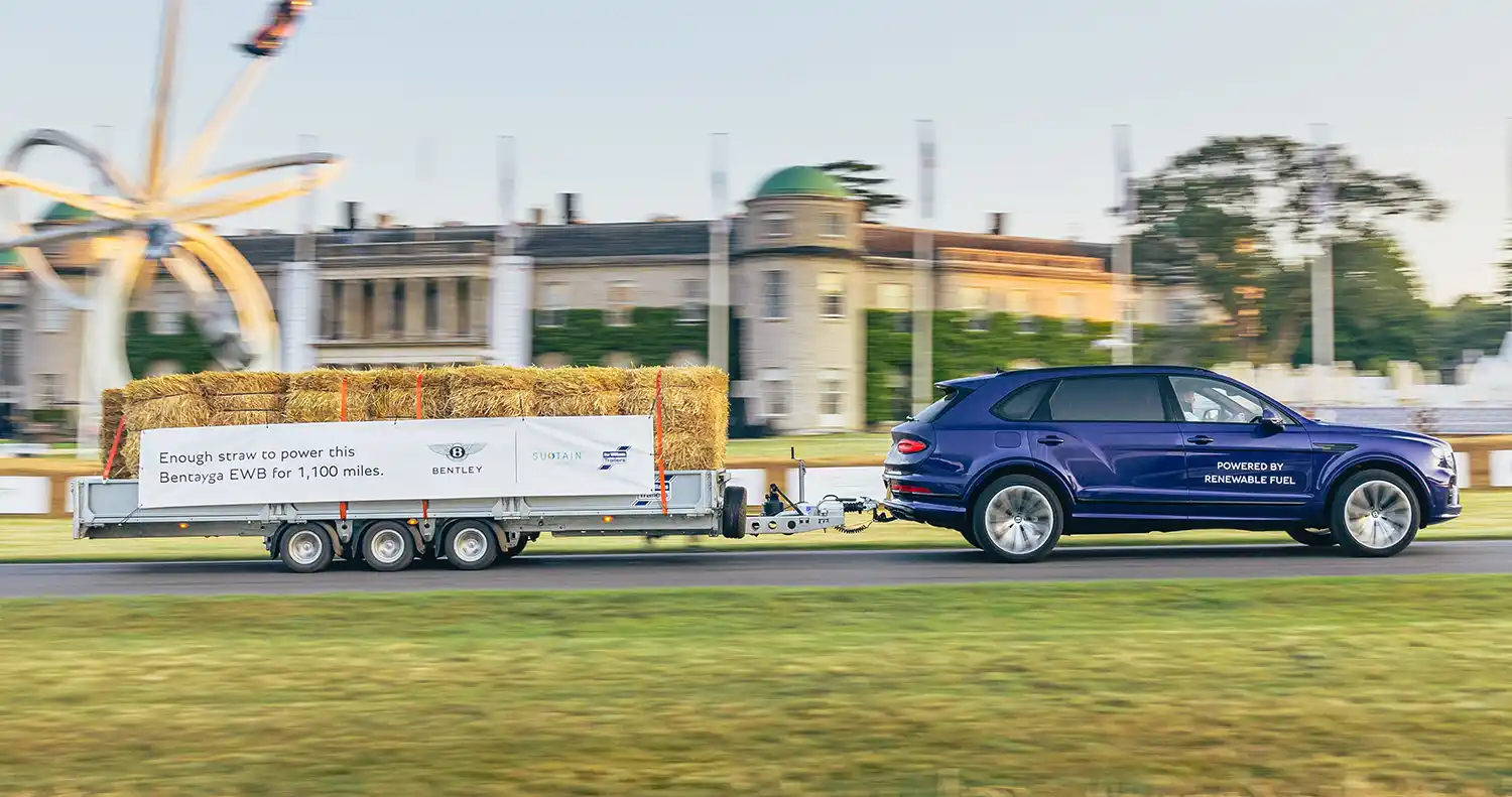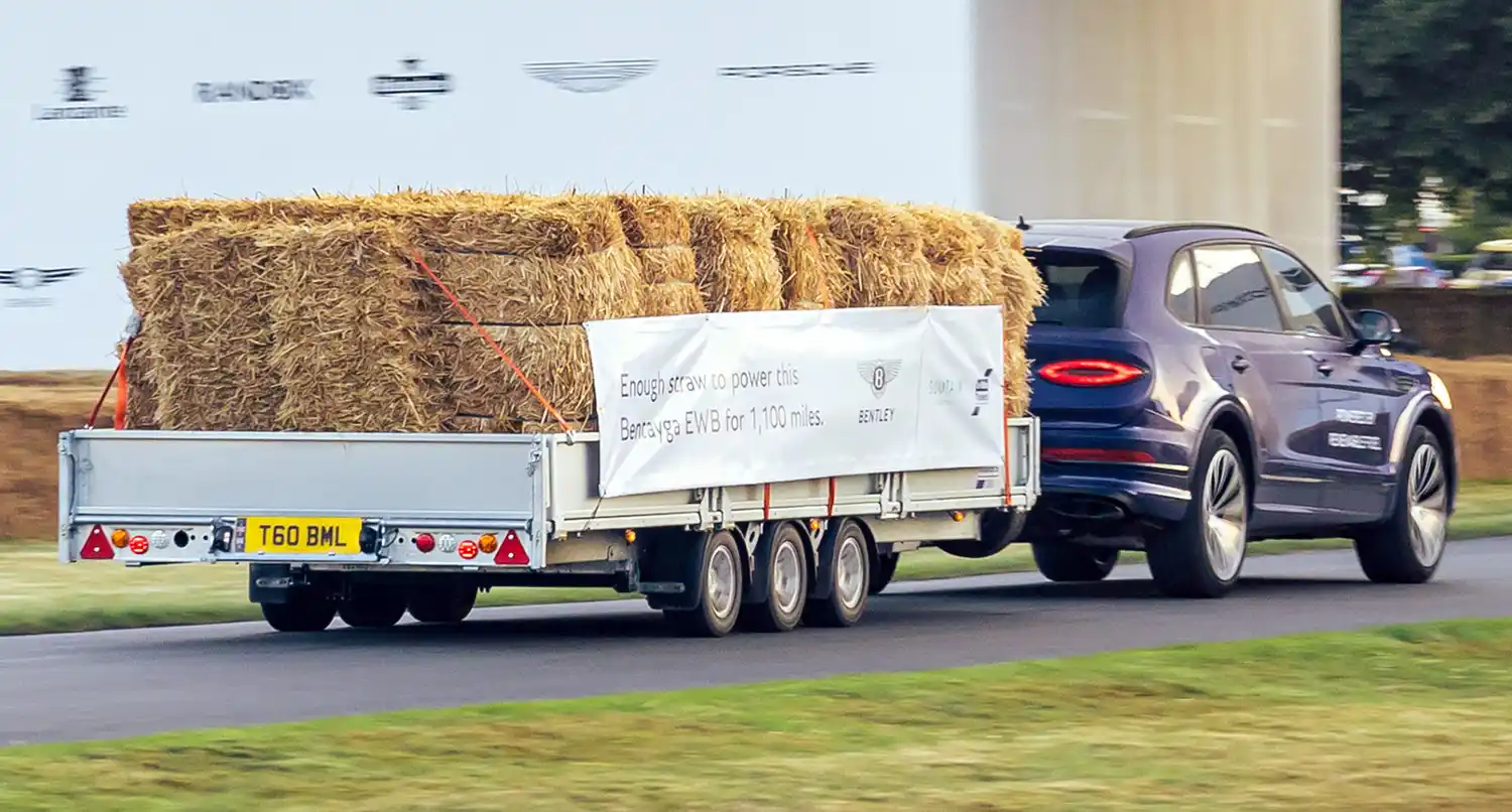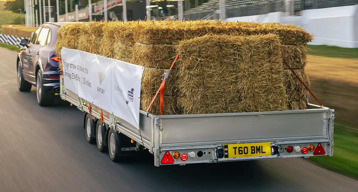 Bentley’s renewably-powered showcase at Goodwood Festival of Speed was opened in dramatic fashion this morning, with the announcement of a new, albeit unofficial, hillclimb record – fastest car with a trailer. A Bentayga EWB, Bentley’s newest flagship, completed the hill climb at speed in just 1 minute 21 seconds – impressive enough, but made even more surprising by the fact it was towing 2.5 tonnes of straw in a specially-prepared Ifor Williams trailer.
