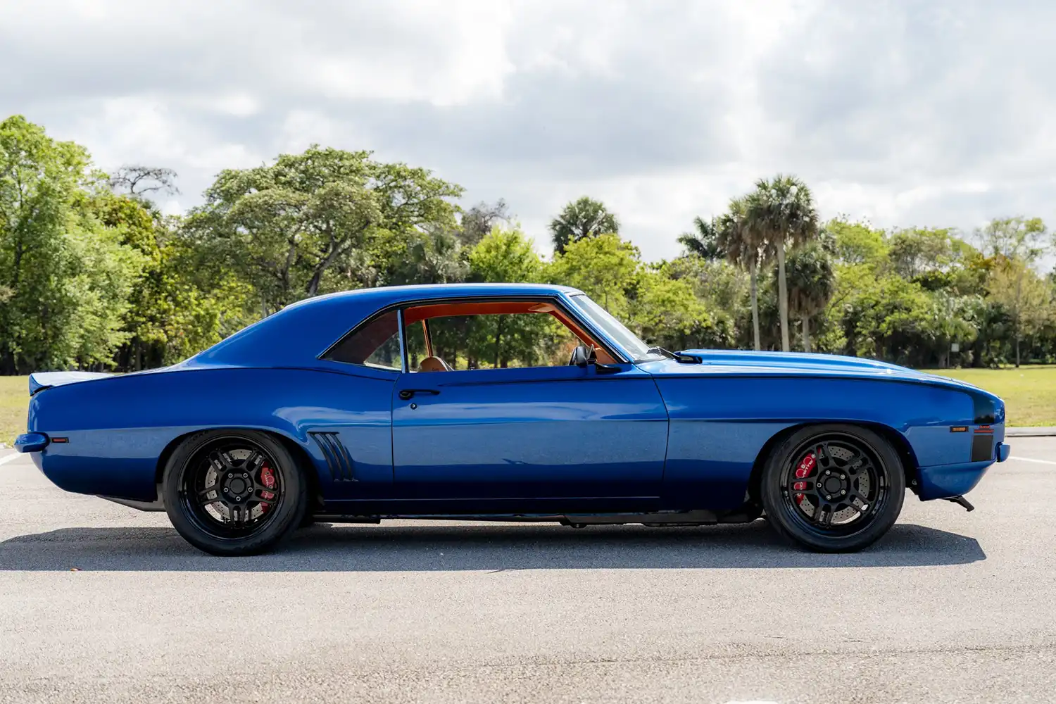 The exterior of this Camaro has been refinished in a striking metallic blue, a modern touch that complements its iconic 1969 lines. A color-matched rear spoiler and a cowl-induction hood enhance its aggressive stance. Modern hide-away headlights and a front lip spoiler have been seamlessly integrated into the classic design. The car rides on a state-of-the-art SpeedTech Performance suspension system, featuring rack-and-pinion power steering for precise control, tubular front A-arms, and a four-link rear setup for improved handling. Viking adjustable coilovers allow for fine-tuning of the ride and handling characteristics. Braking performance is significantly upgraded with Corvette C6 brakes, providing exceptional stopping power. The staggered three-piece Fikse wheels, measuring 275/35 at the front and 335/30 at the rear, are wrapped in high-performance Toyo Proxes tires, ensuring excellent grip and a commanding presence.