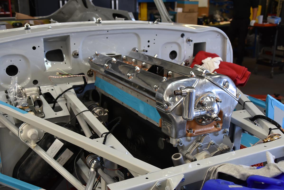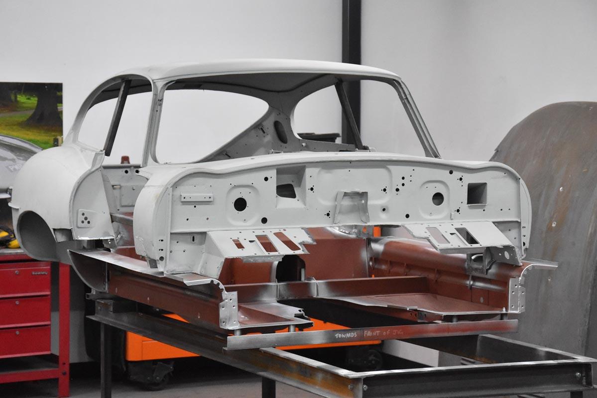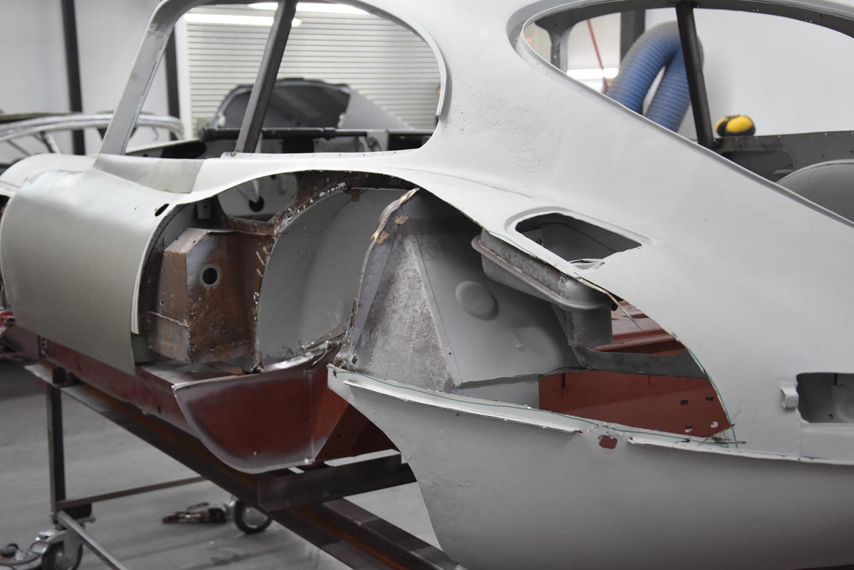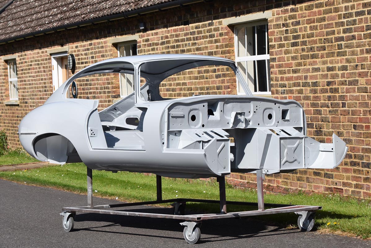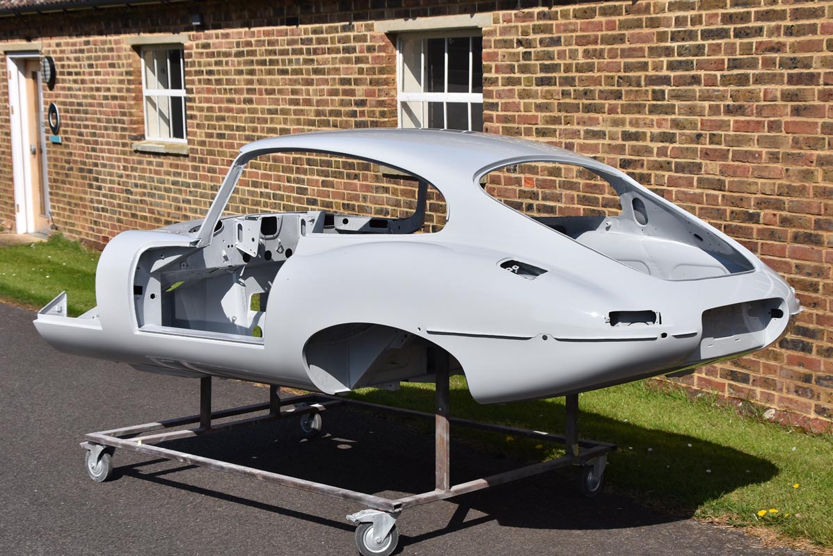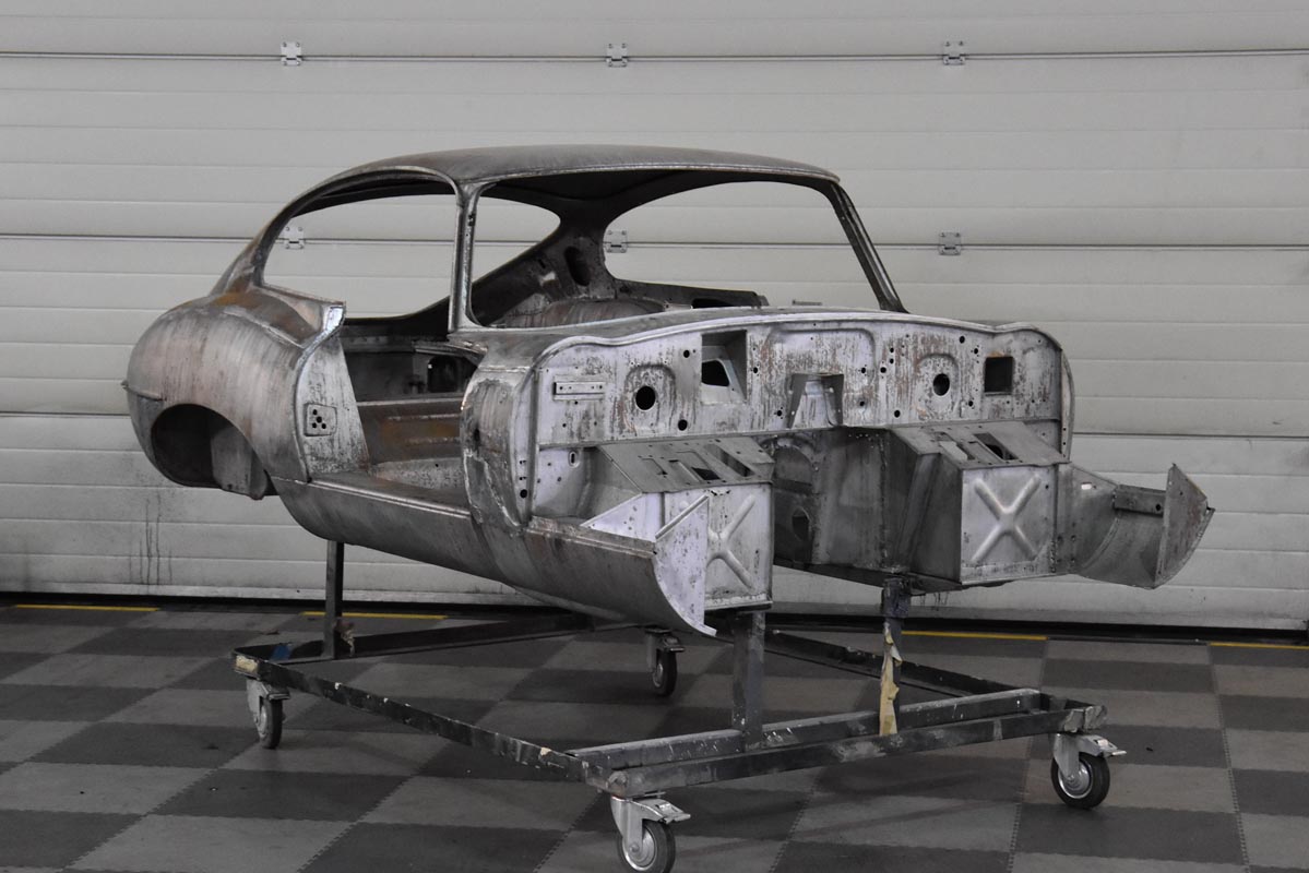 With the careful restoration of the 1964 Series 1 FHC Jaguar E-type’s metal shell complete, the unmistakable silhouette of the 1960s icon begins to take shape.