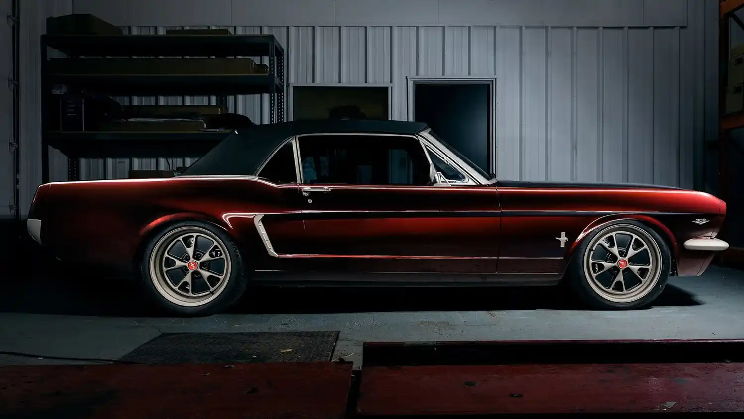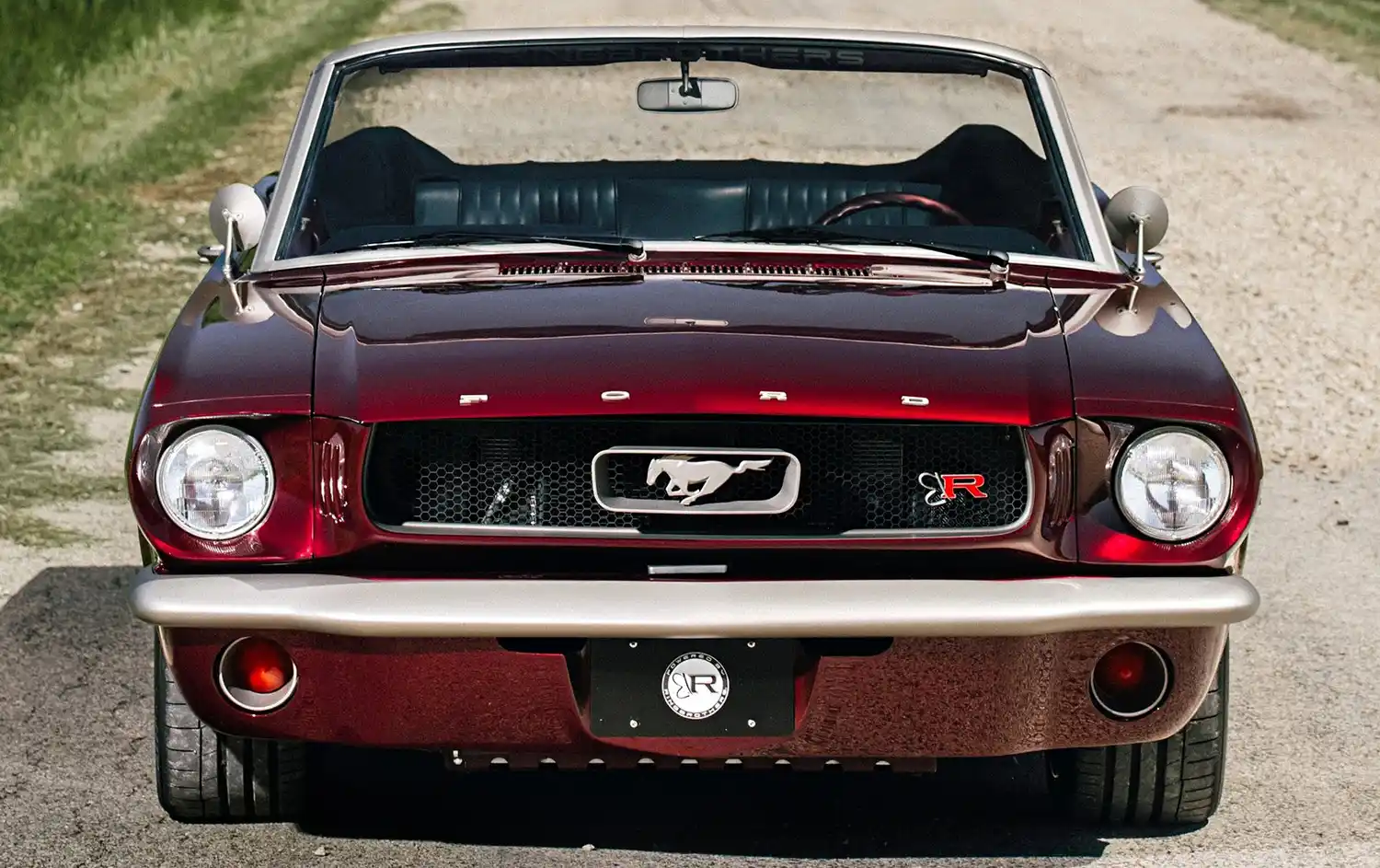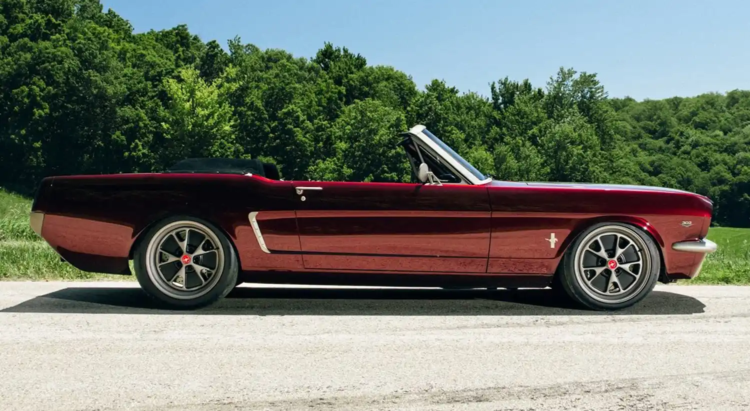 Born from an original 1964.5 Mustang convertible, nearly every component is a Ringbrothers-built one-off piece, with the only factory Mustang parts being the center caps for the wheels. The Ringbrothers team conducted extensive metalwork converting the Roadster Shop FAST TRACK chassis back into a unibody, as well as widening and lengthening the bodywork by one inch. The BASF Glasurit “Burgundy Brave” finish was then applied, and all the chrome and stainless-steel trim was treated with Cerakote Titanium C-105P.